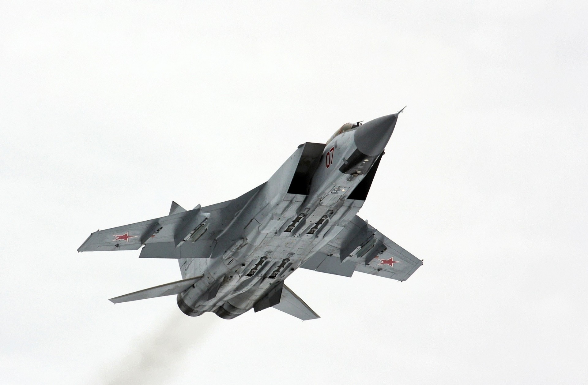 Two-seat mig-31 fighter jet on a blue sky background