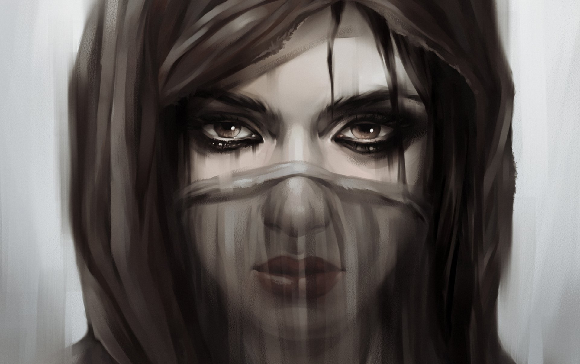 A girl in a translucent mask stares intently into her eyes