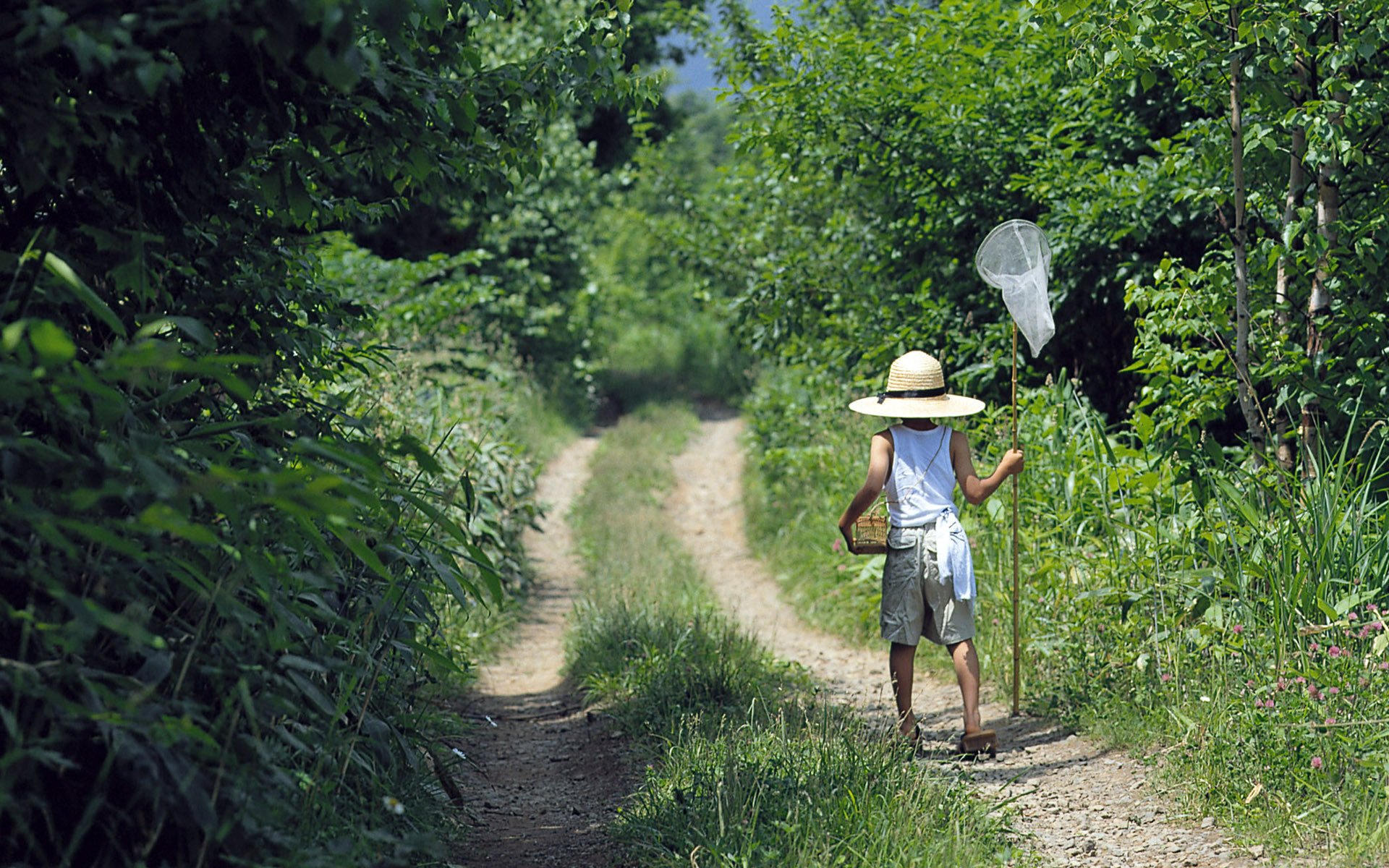 A girl in a red raincoat walks along the tram tracks. sheltering under an umbrella from the wet snow