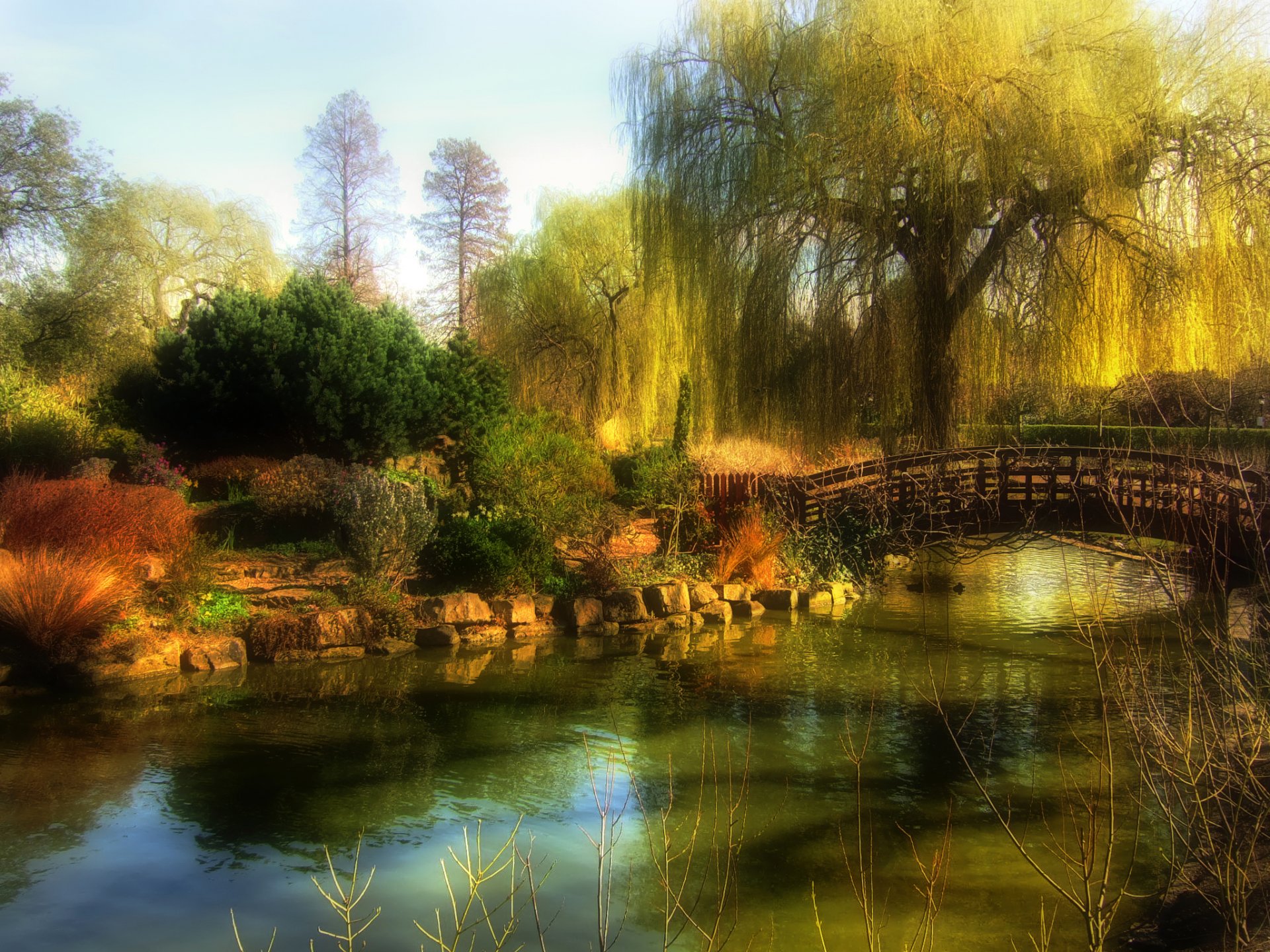 A girl with a red umbrella over a tree in the desert against a cloudy sky