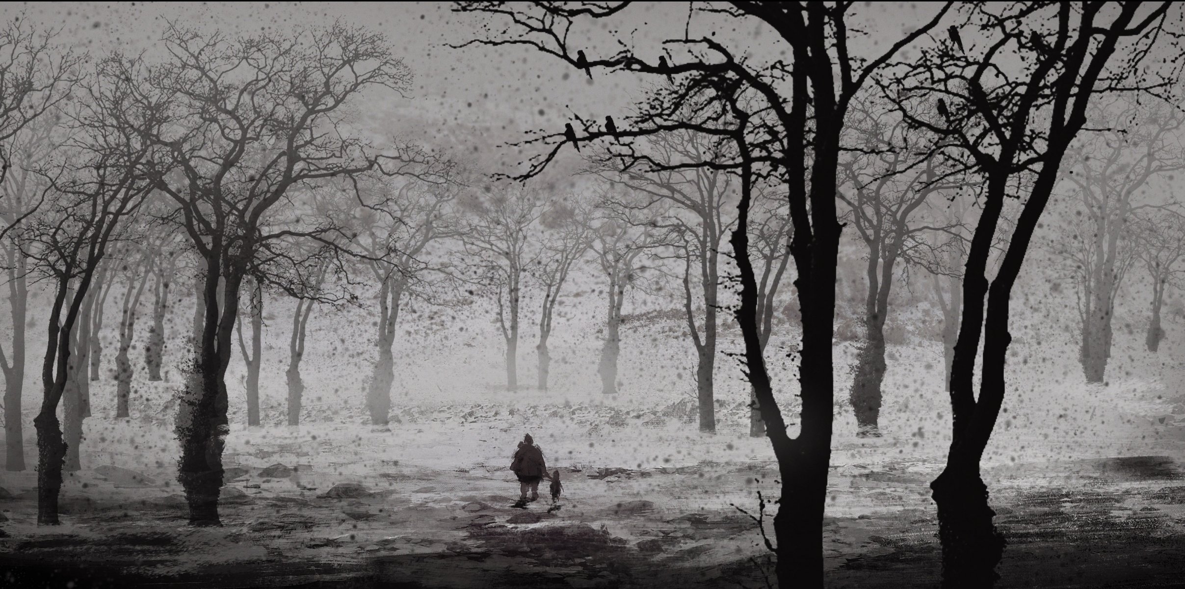 Adult and child in a black and white painted forest