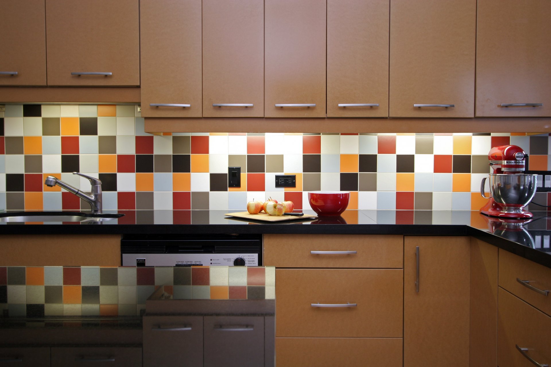 Bright kitchen with colored dishes and colorful tiles on the wall