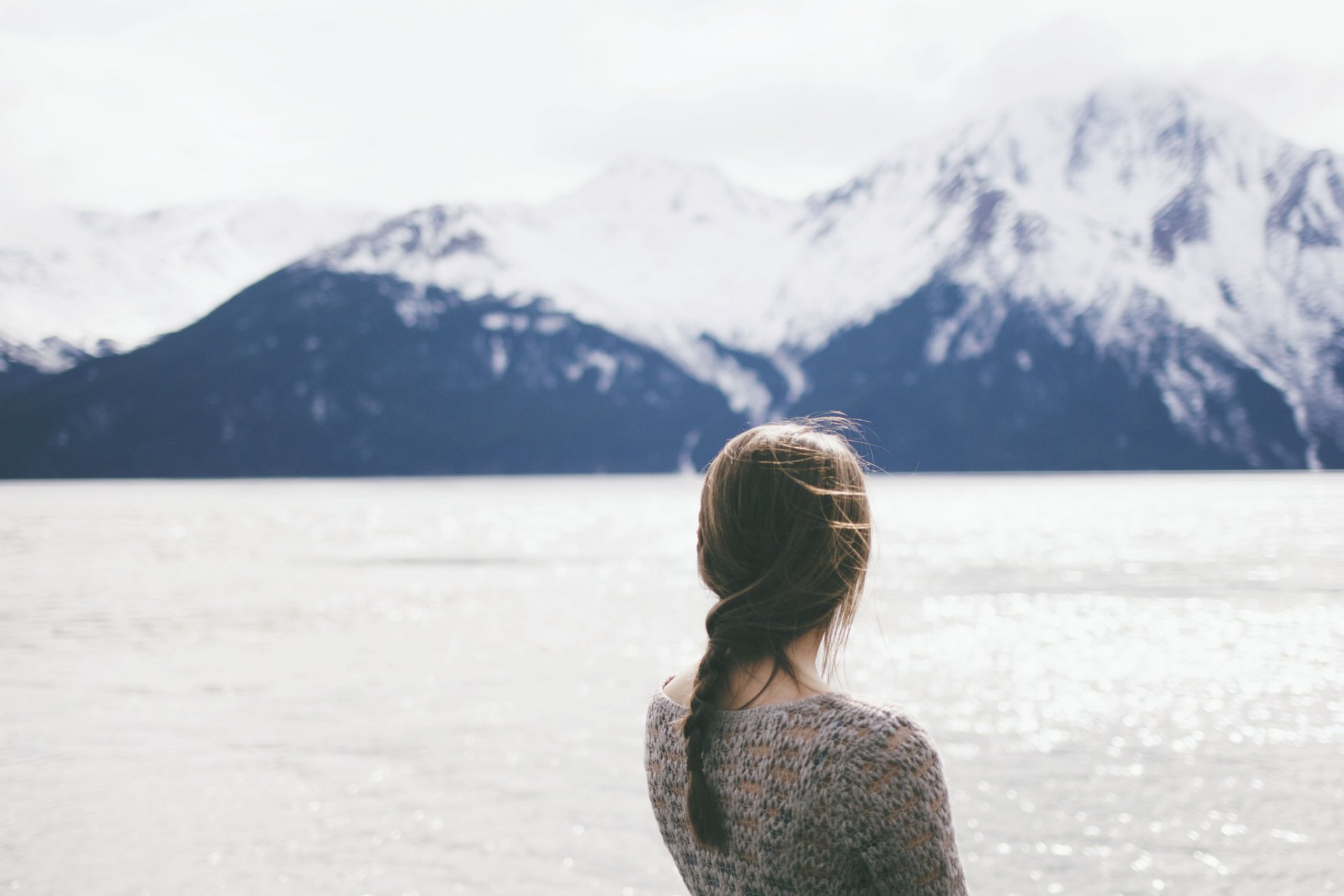 Abstract glowing purple infinity sign flying away from the wind on the background of a snow-covered valley with rocks