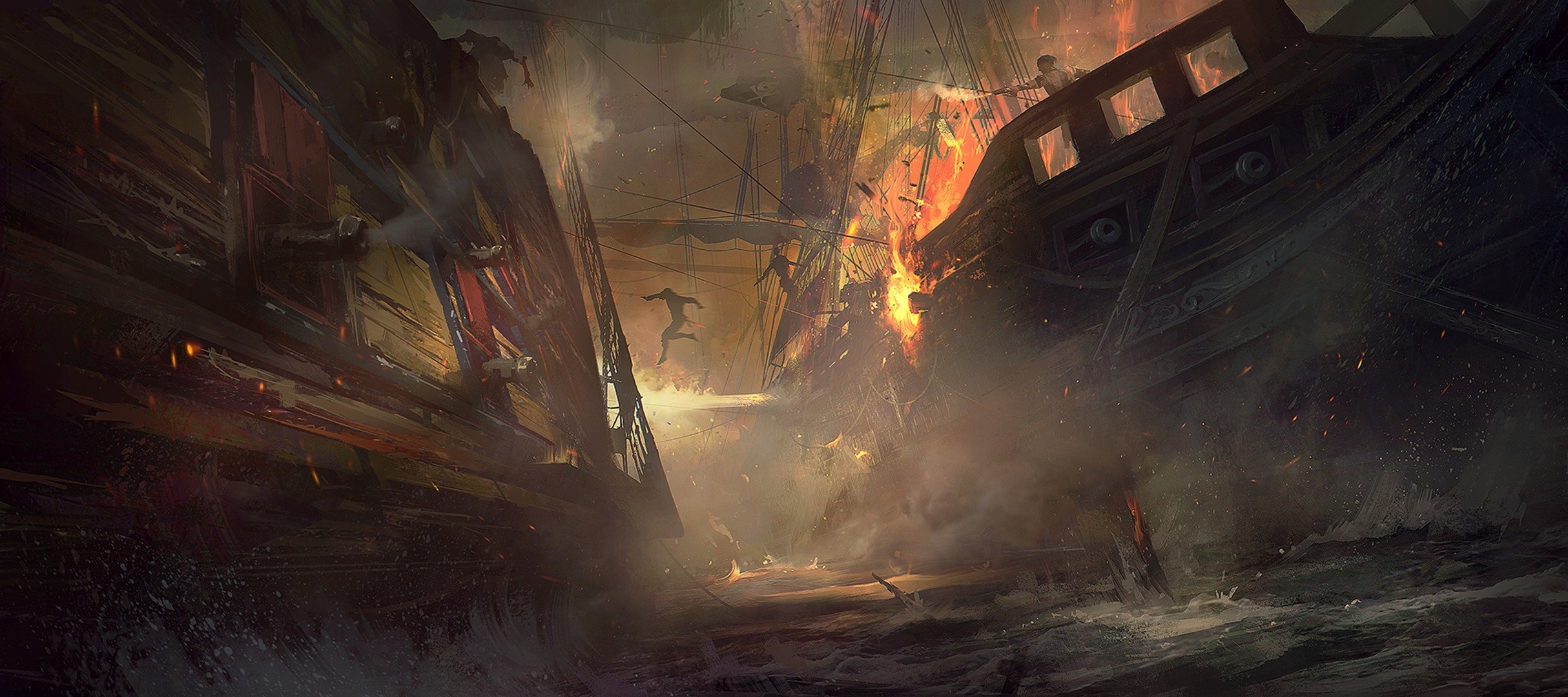 Explosion on a ship in the sea cannon