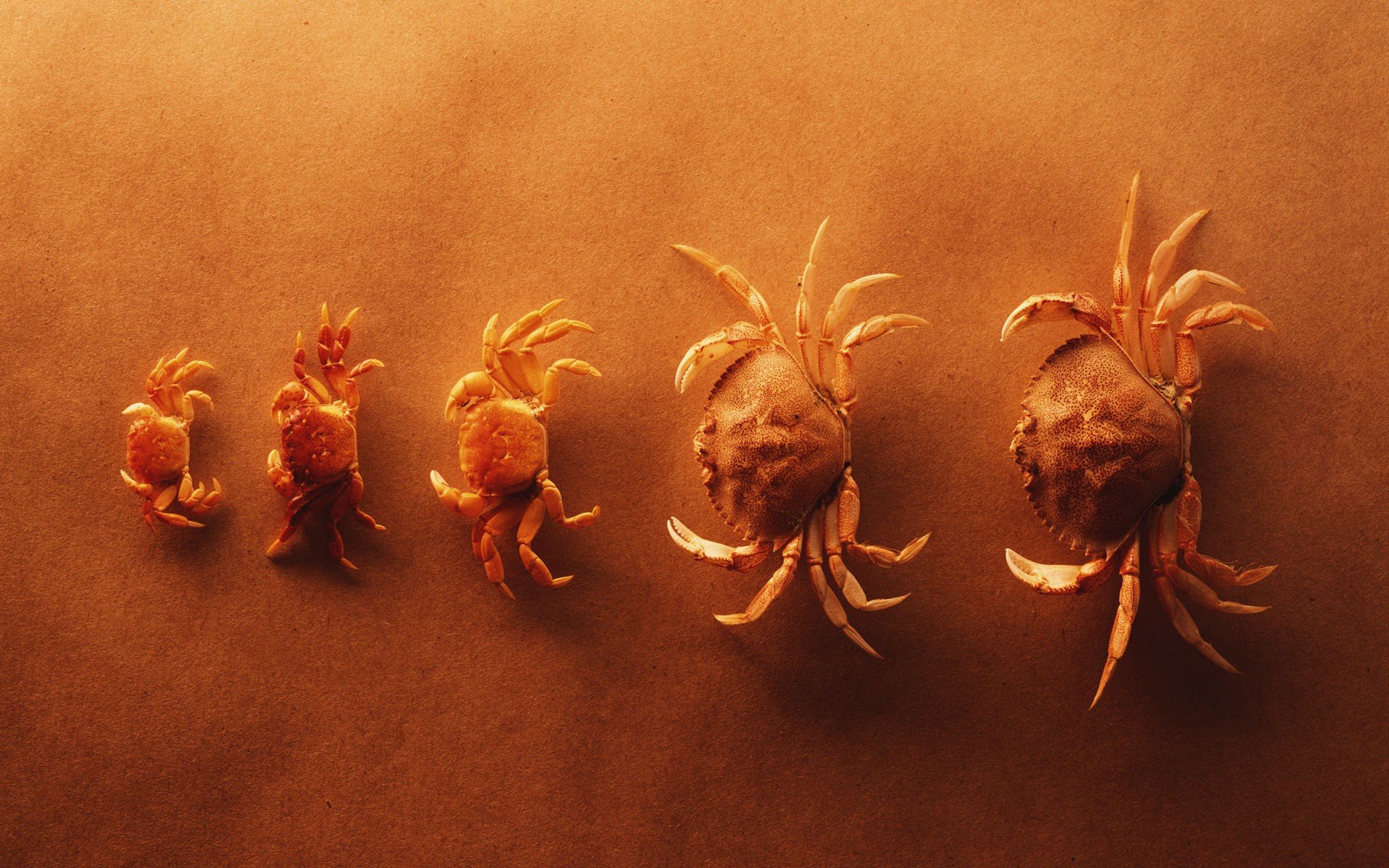 Five yellow crabs on the sand