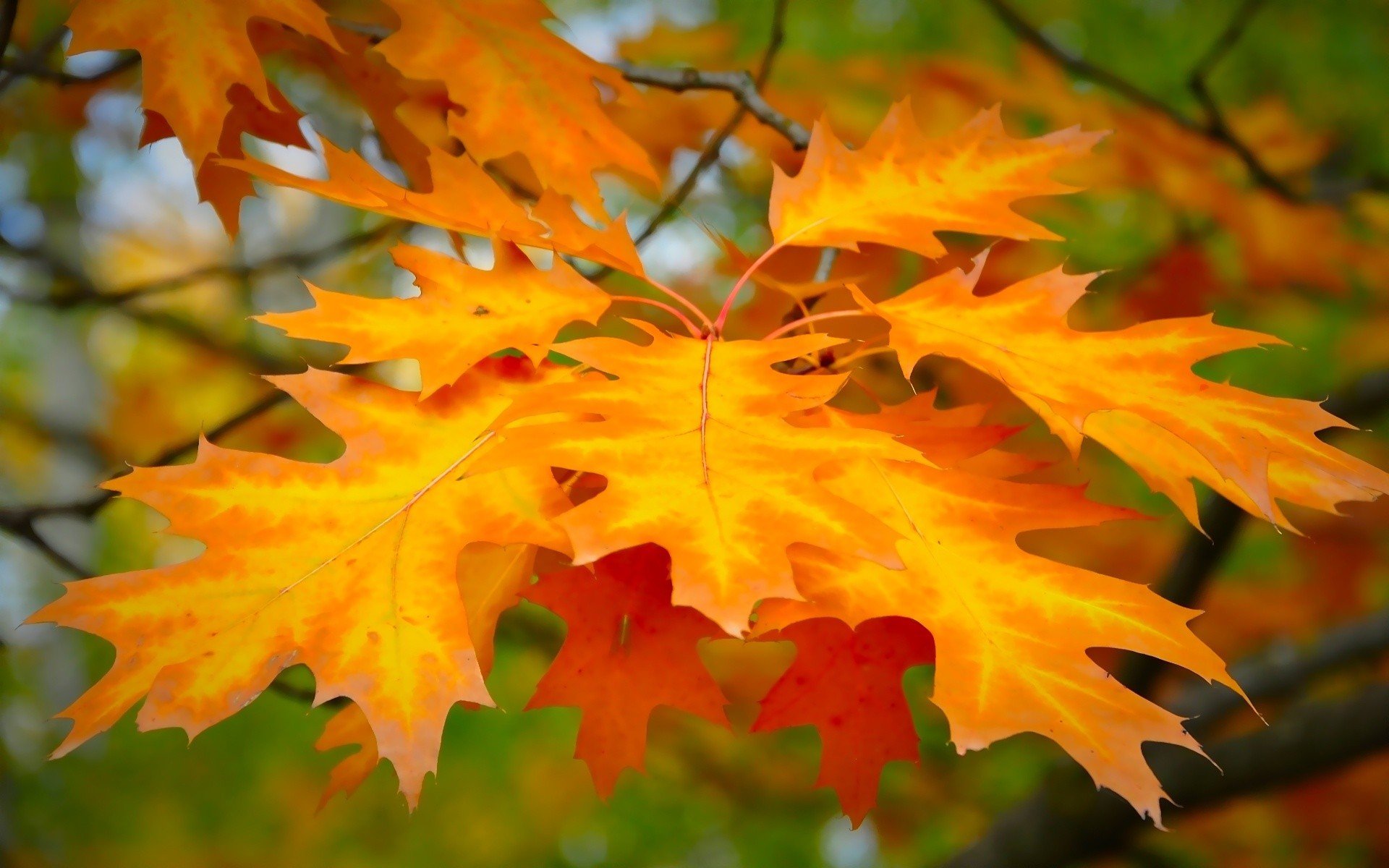 Maple and oak leaves in the yellow-orange colors of autumn lying on the boards