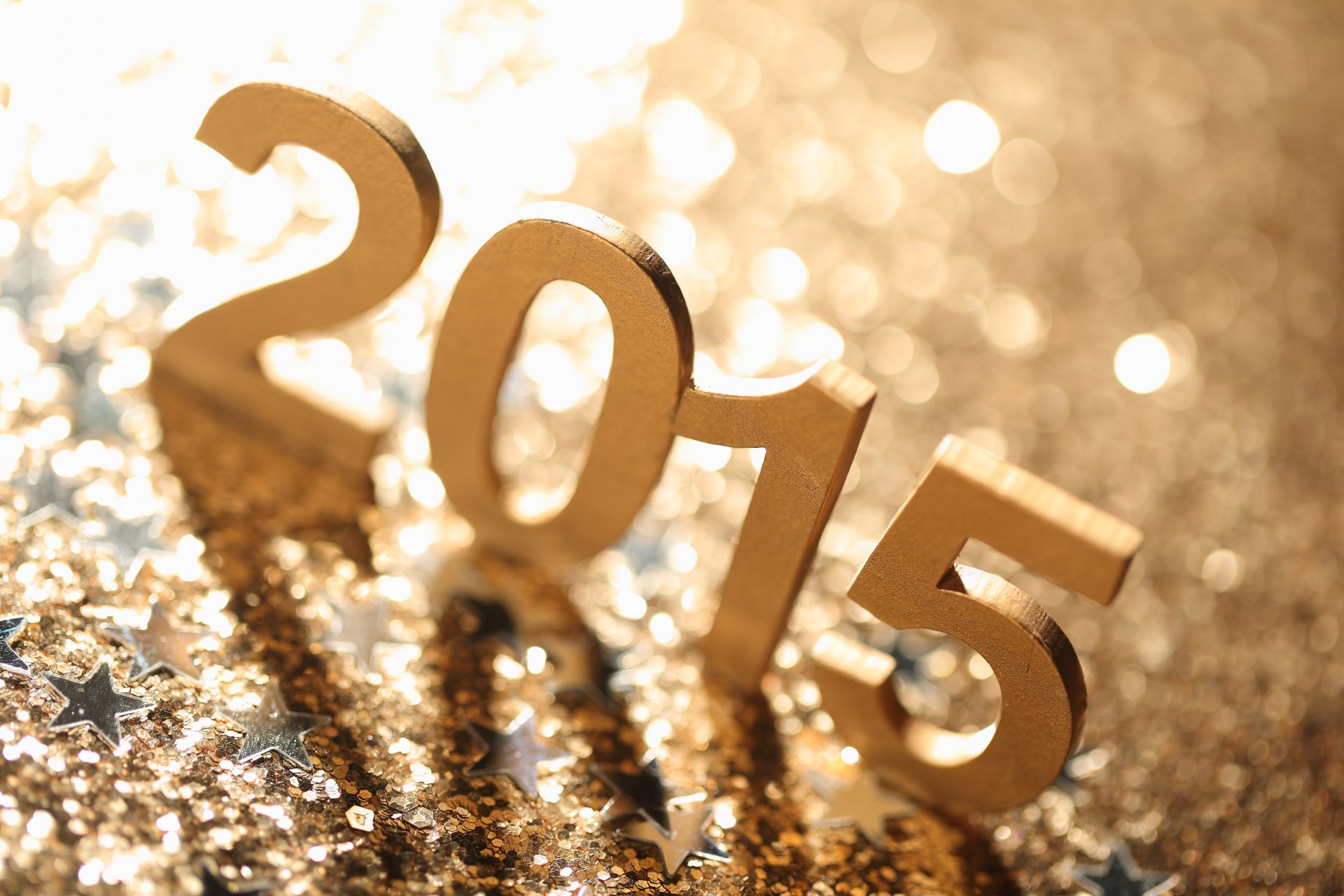 On a dark blue background there is a glowing inscription 2015 and fireworks