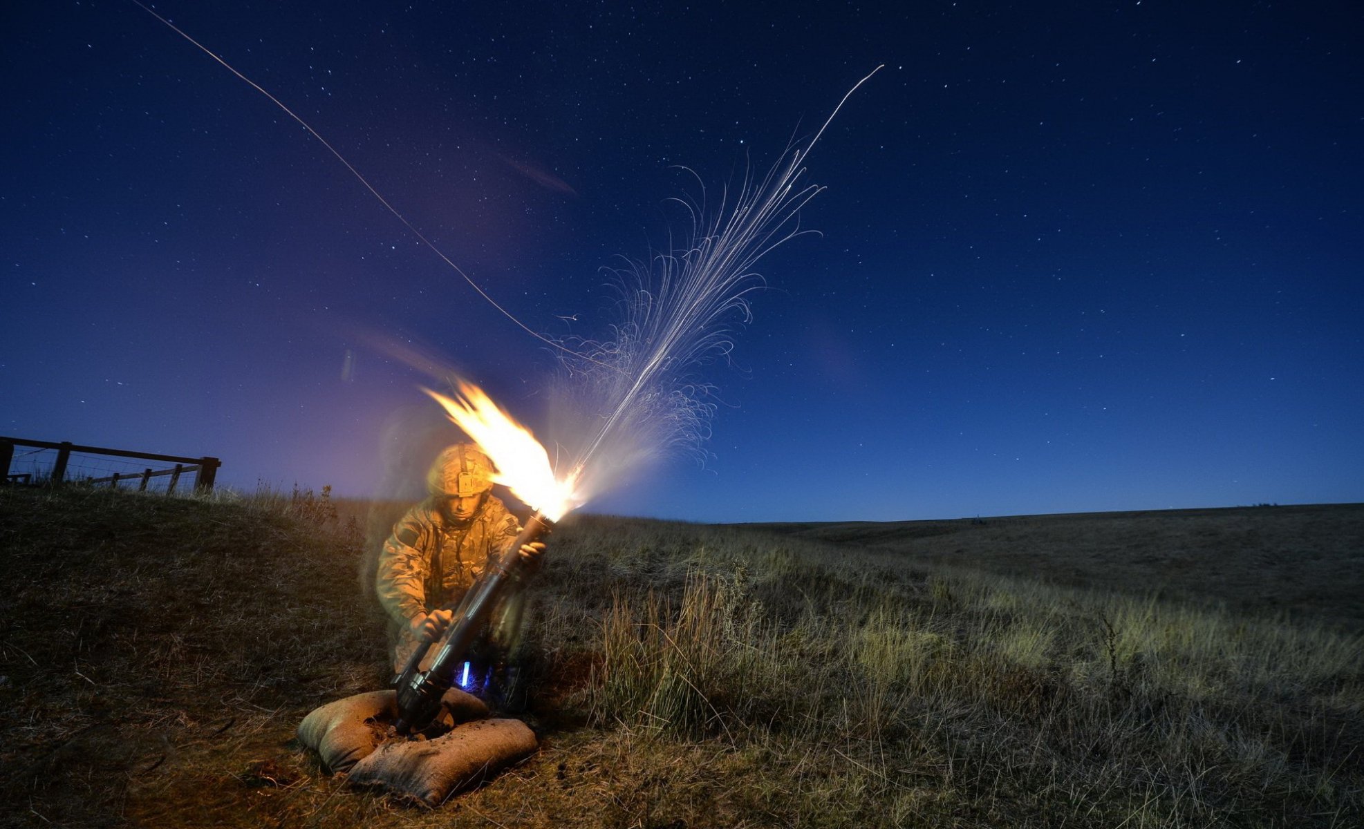 A shot of fire from a tank in the desert