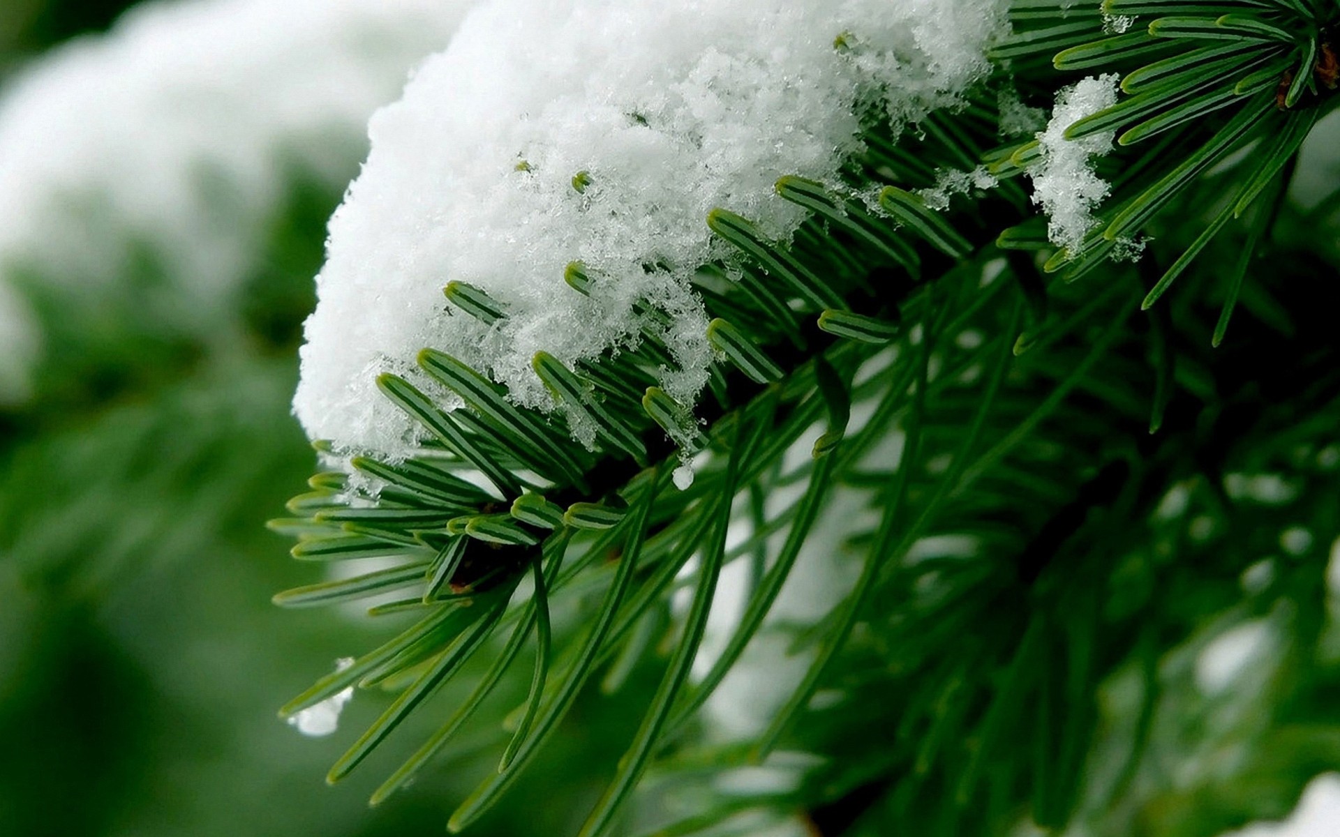 A winter stream is bubbling under the branches of snow-covered fir trees