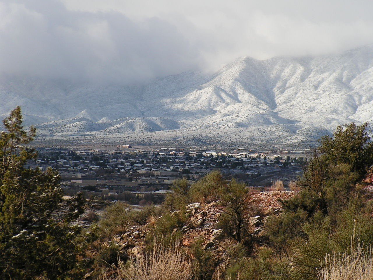 Mountains with trees, and mountains with snow in the distance
