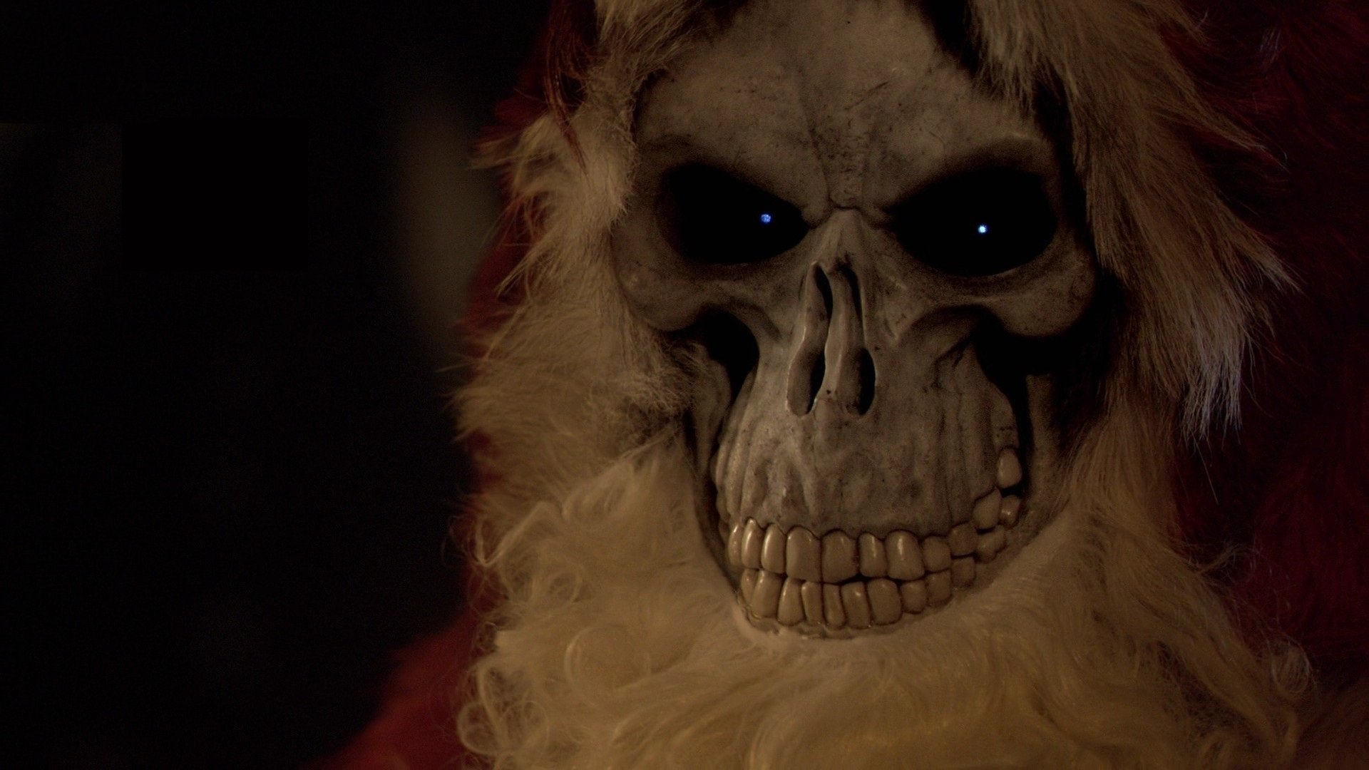 Santa Claus holds a globe that is viewed by a woman and a girl
