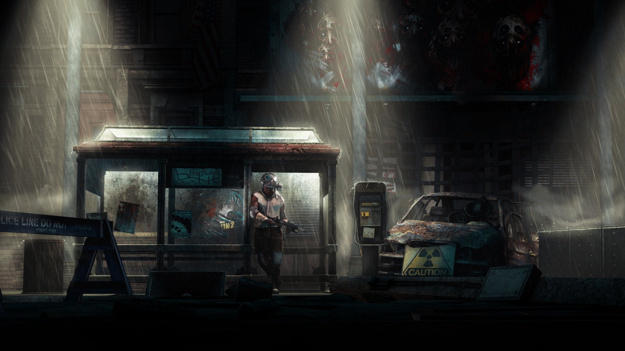 A masked captain with a mug on the background of the ruins of the apocalypse