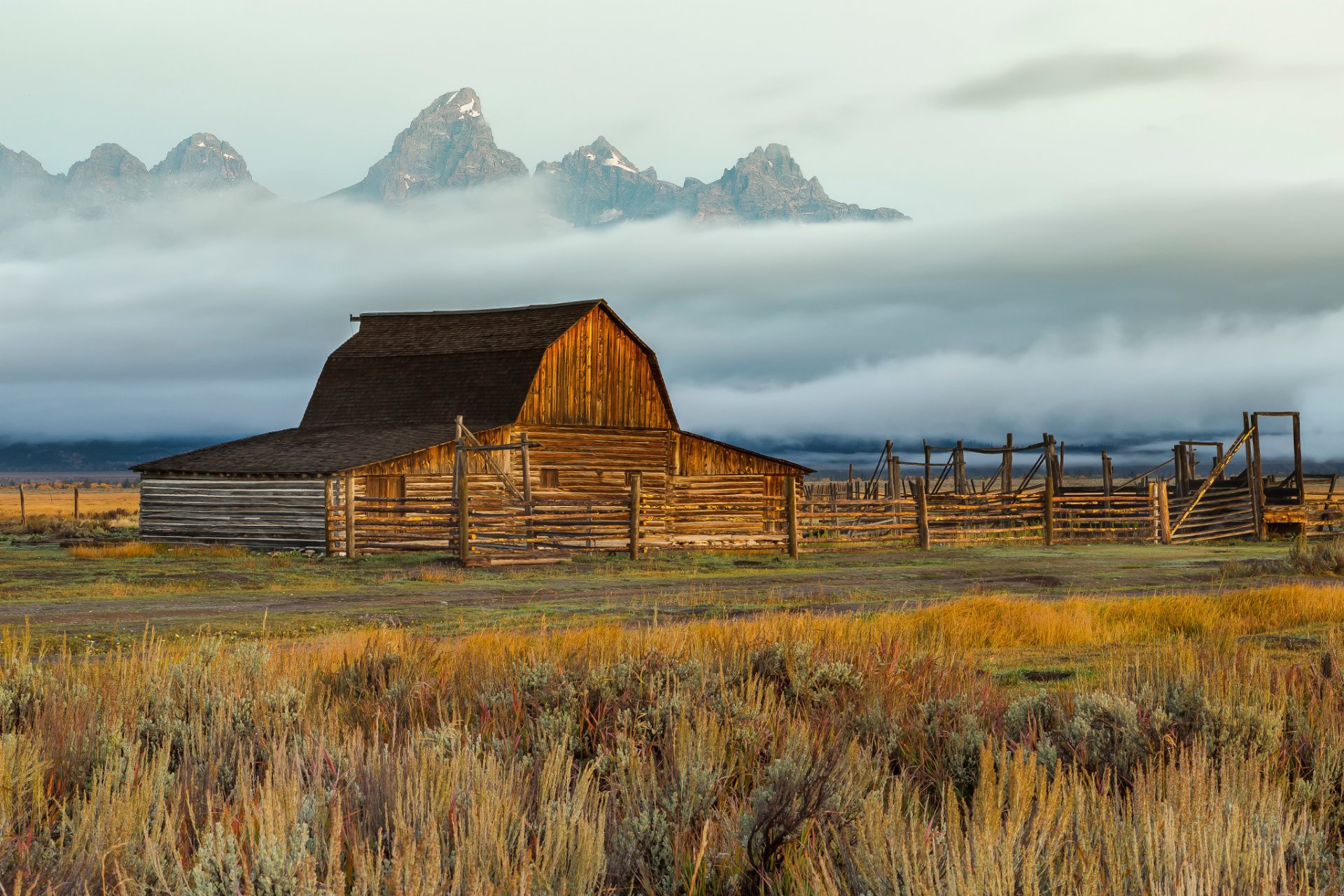 A lonely farm in the wild mountains, shrouded in fog