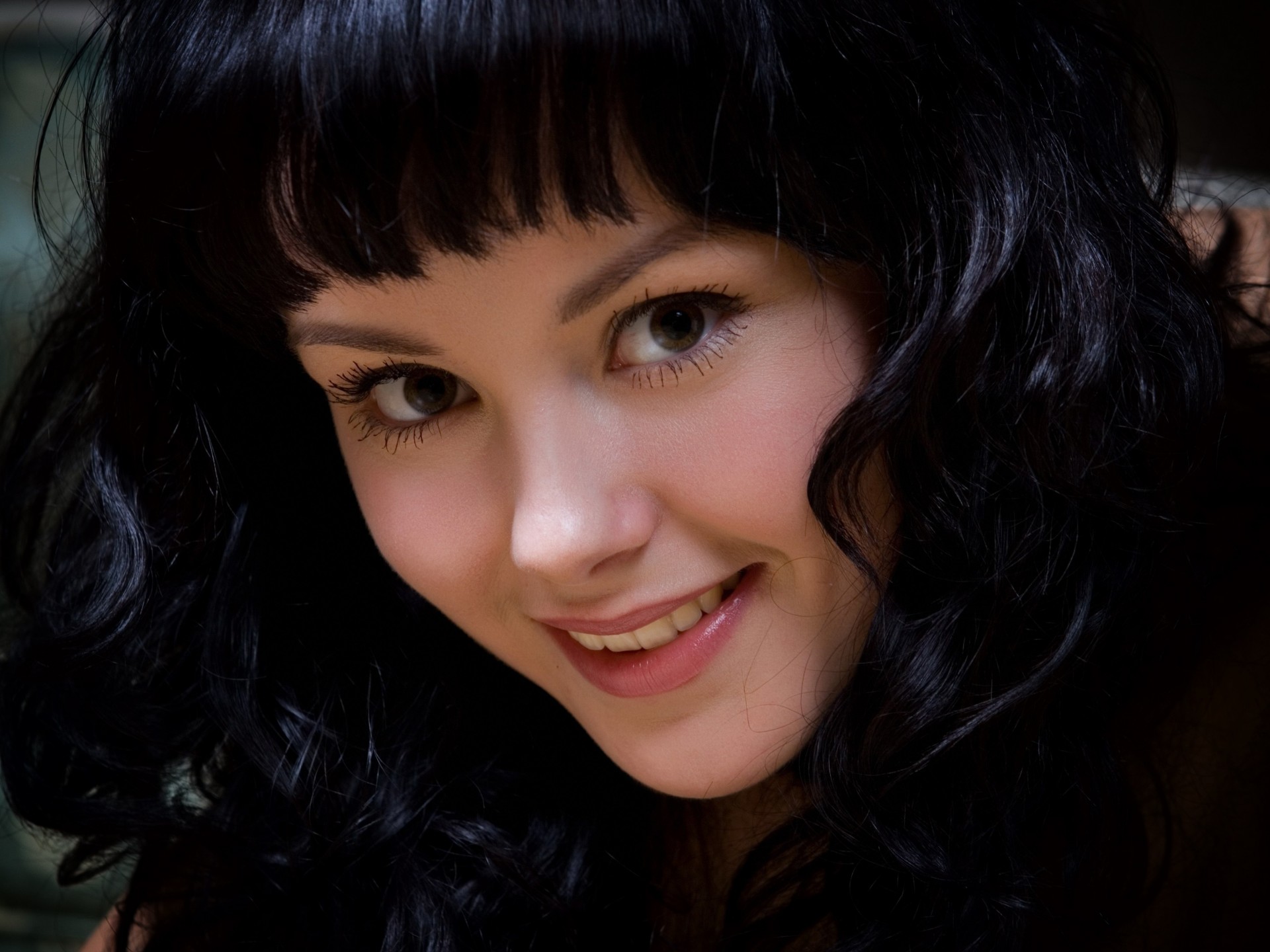 A brown-haired woman with a square with bangs in a pink T-shirt is sitting in front of a white sofa with her arm wrapped around her leg