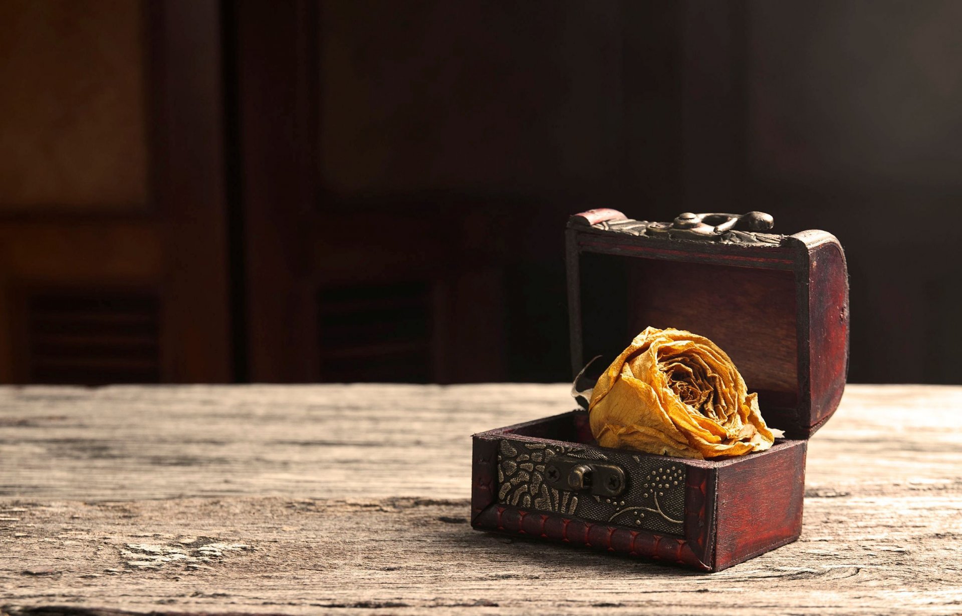 A dried rosebud in a chest