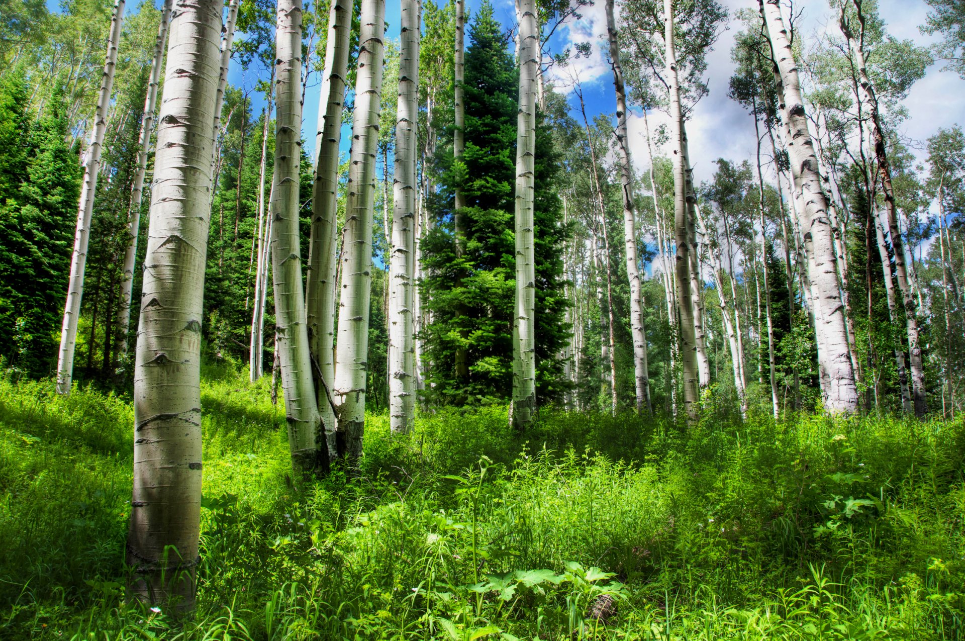 A girl walks in the rain in a birch forest with an umbrella lowered