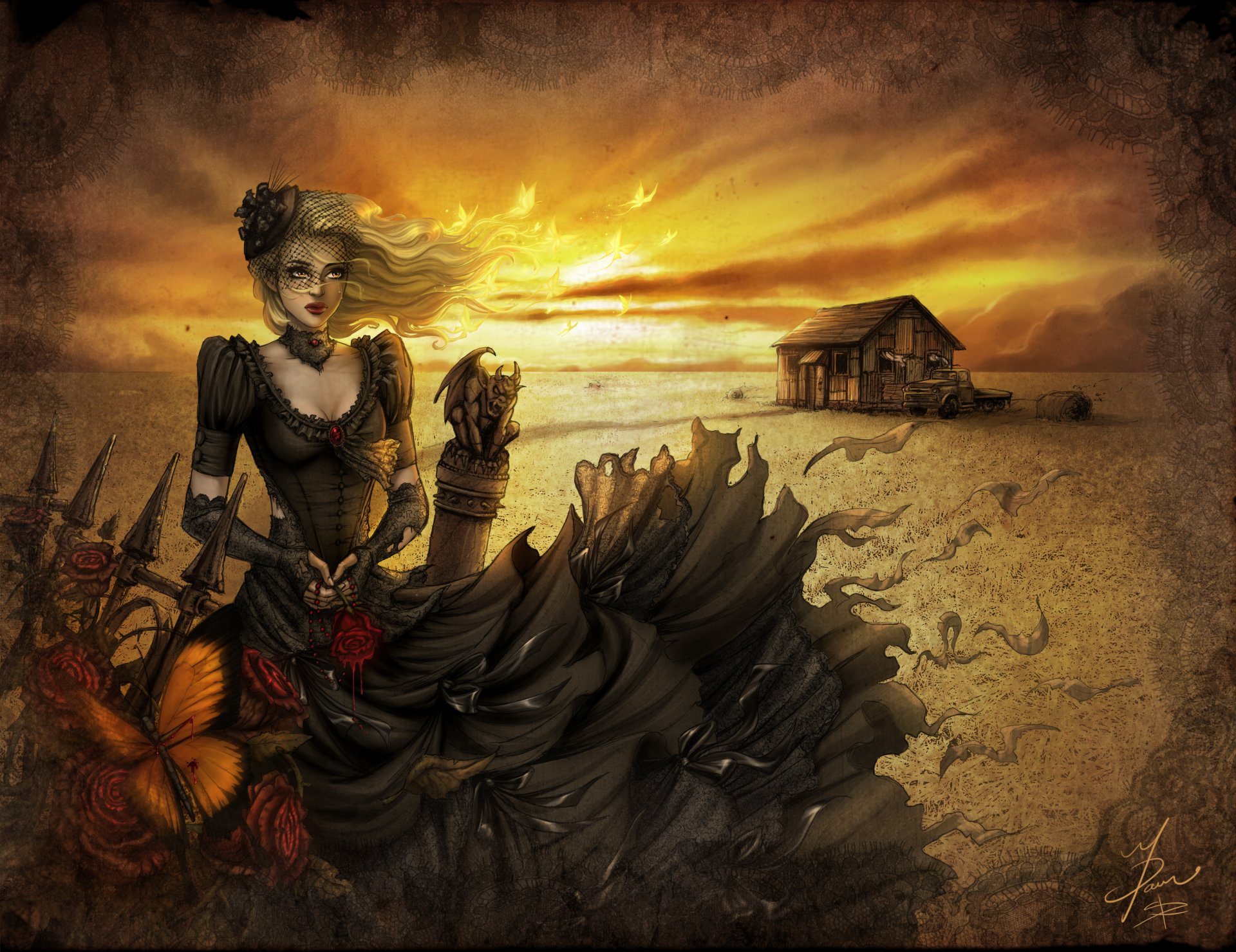 A gothic girl in a black dress and hat on the background of a house and sunset