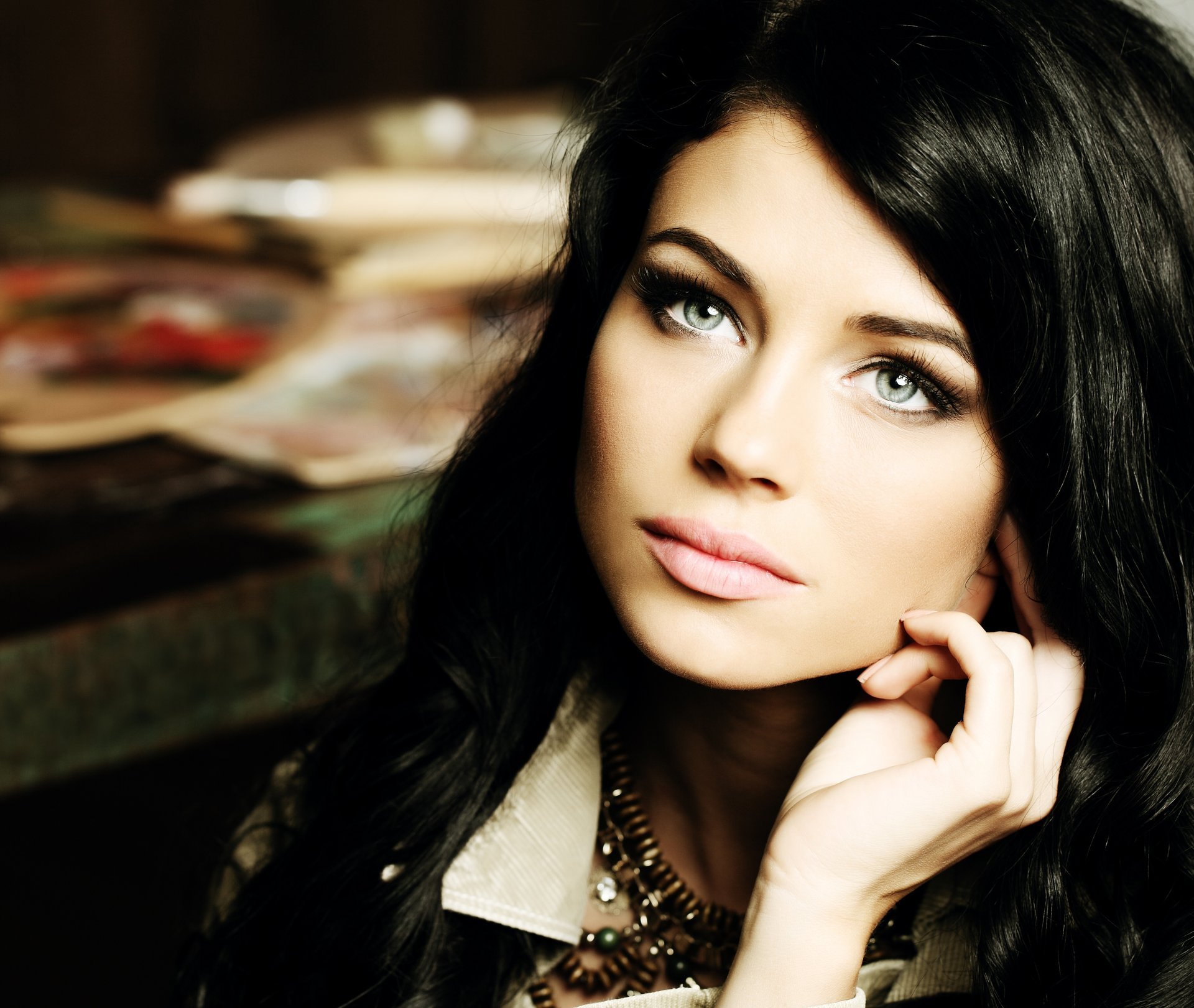 A girl in a black swimsuit, beautiful hair. Blue sky