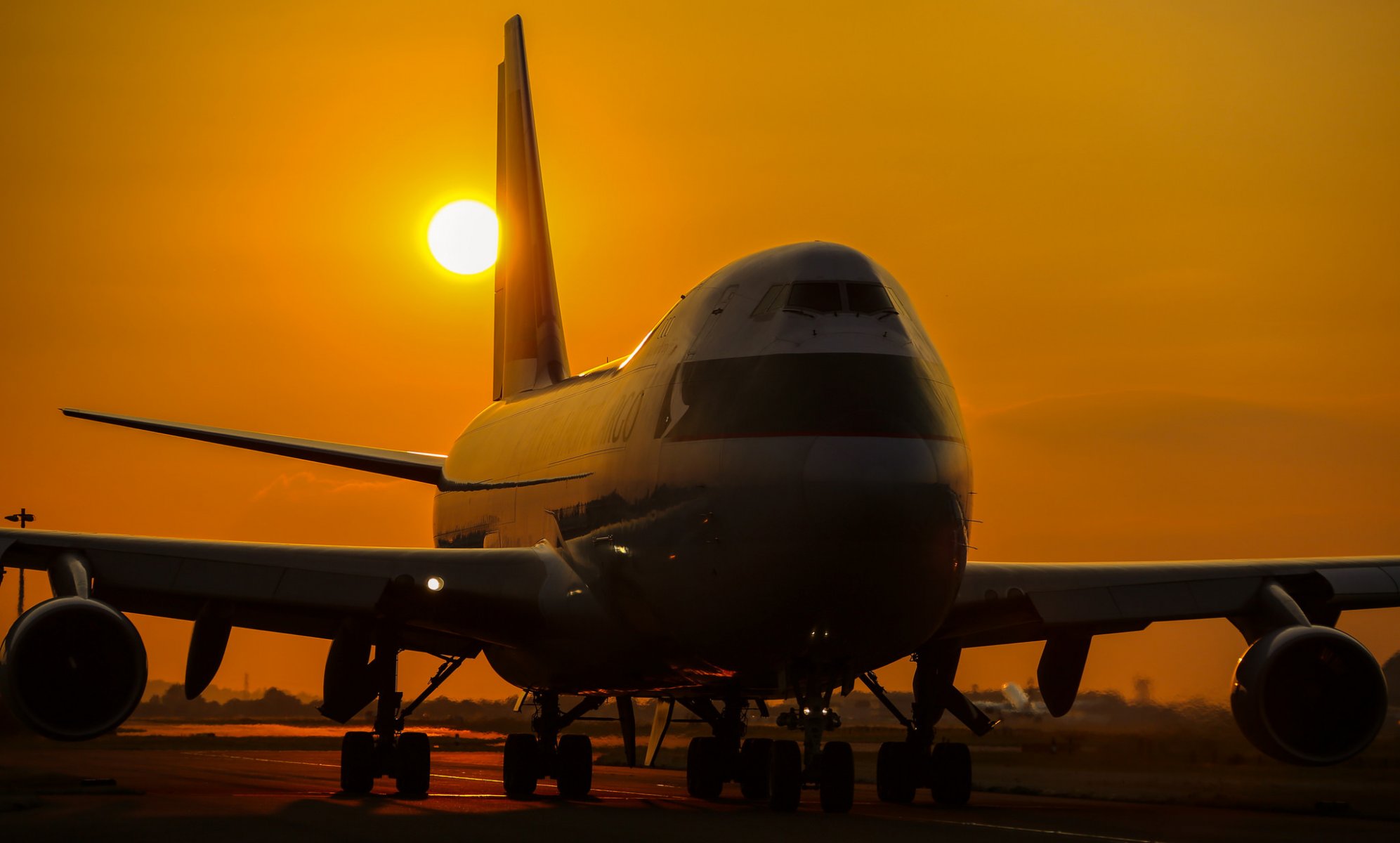 Boeing-747a passenger plane on the background of sunset