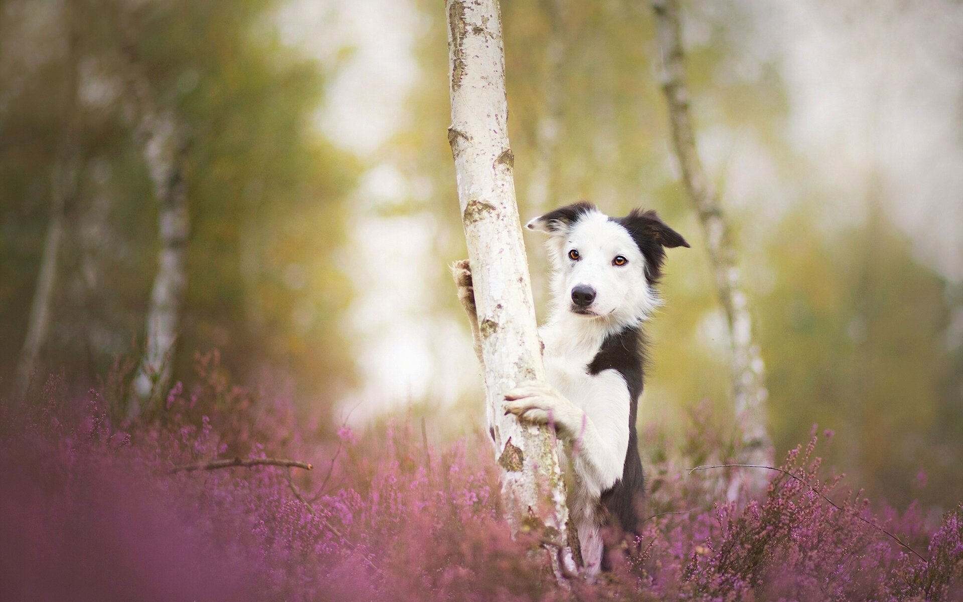 Border collie hugs a tree