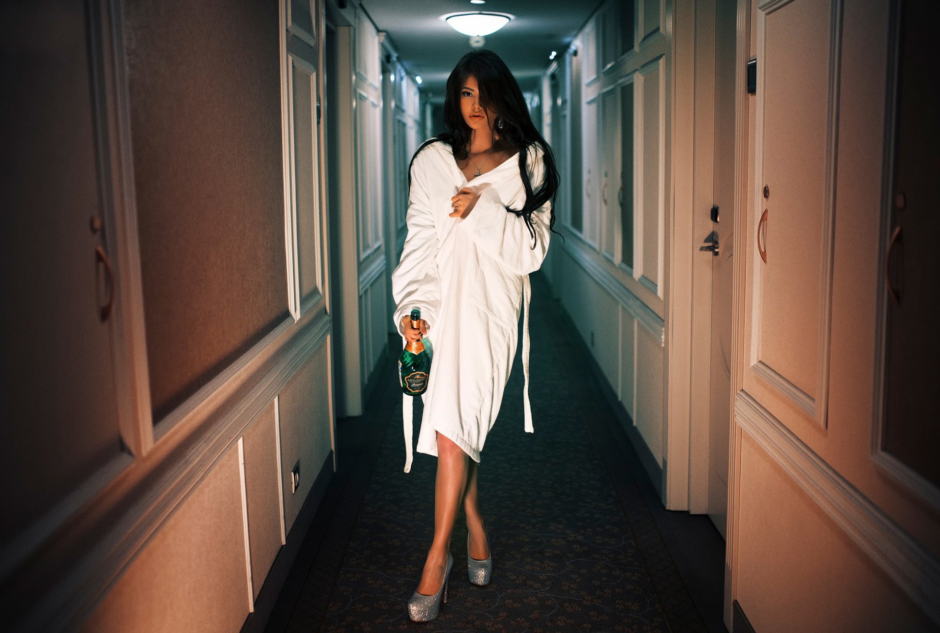 A girl in a bathrobe with a bottle of champagne walks down the corridor of the hotel