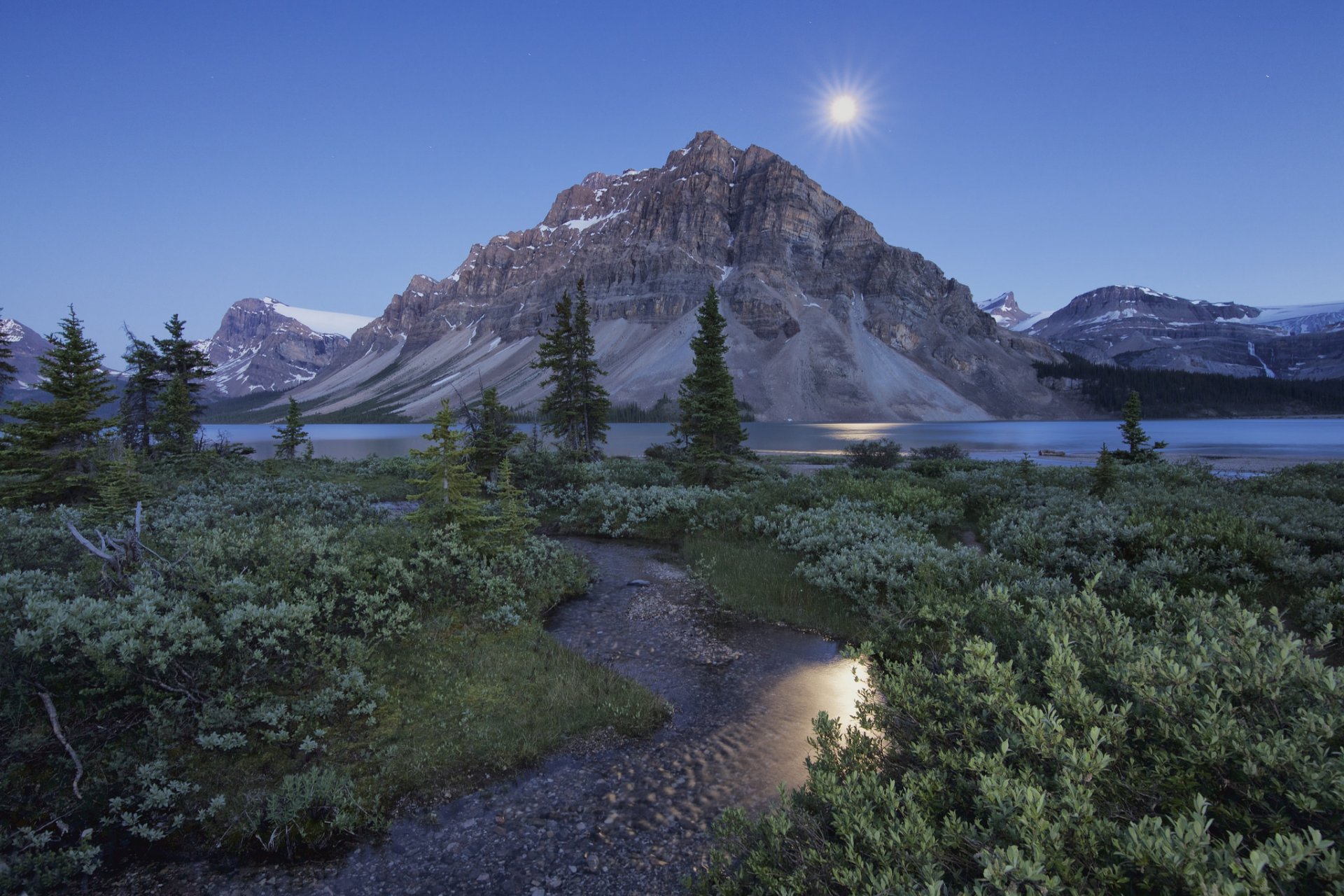 A PARK WITH A LAKE AT THE FOOT OF THE CANADIAN MOUNTAINS