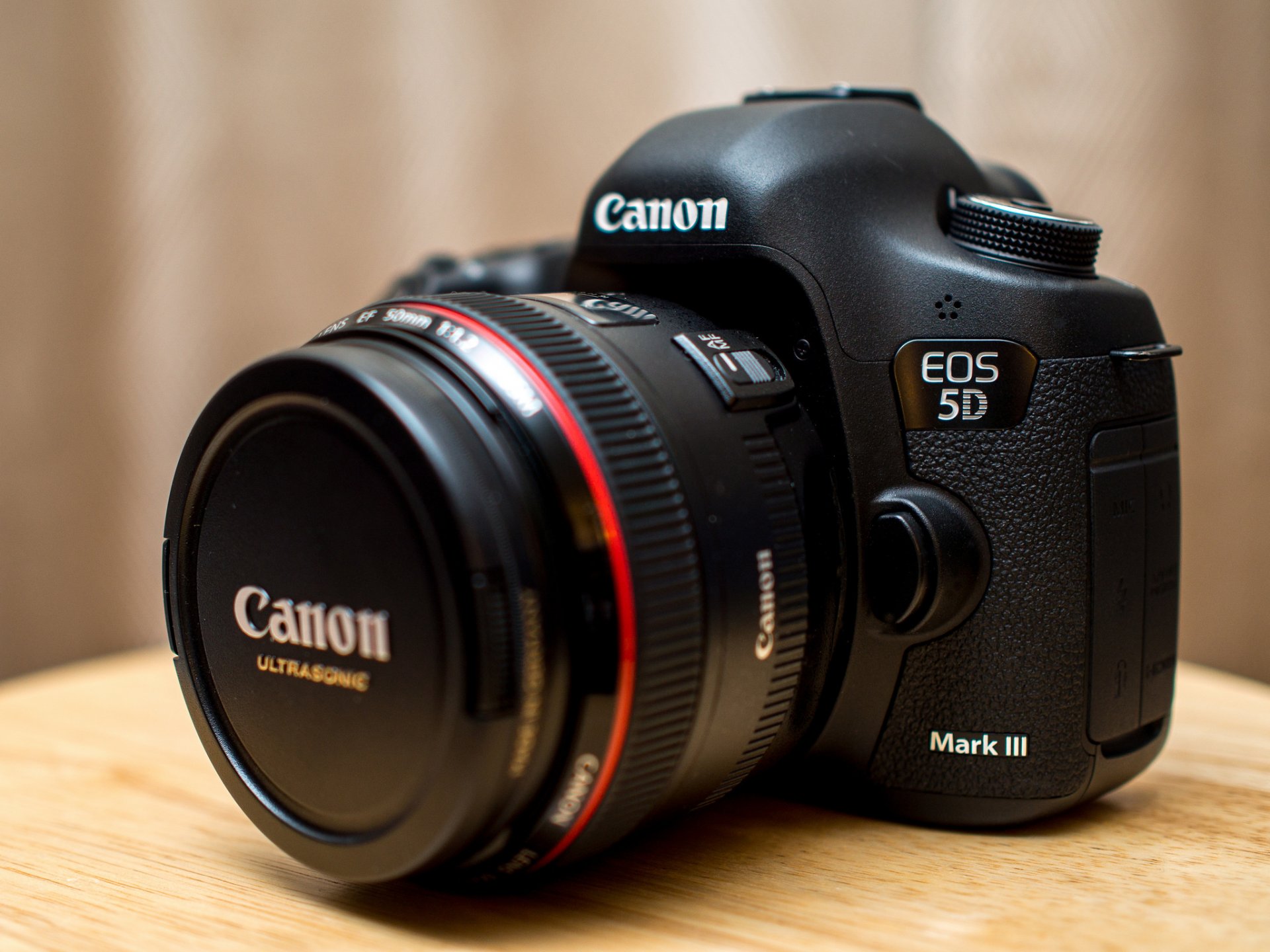 The canon camera stands on a wooden surface