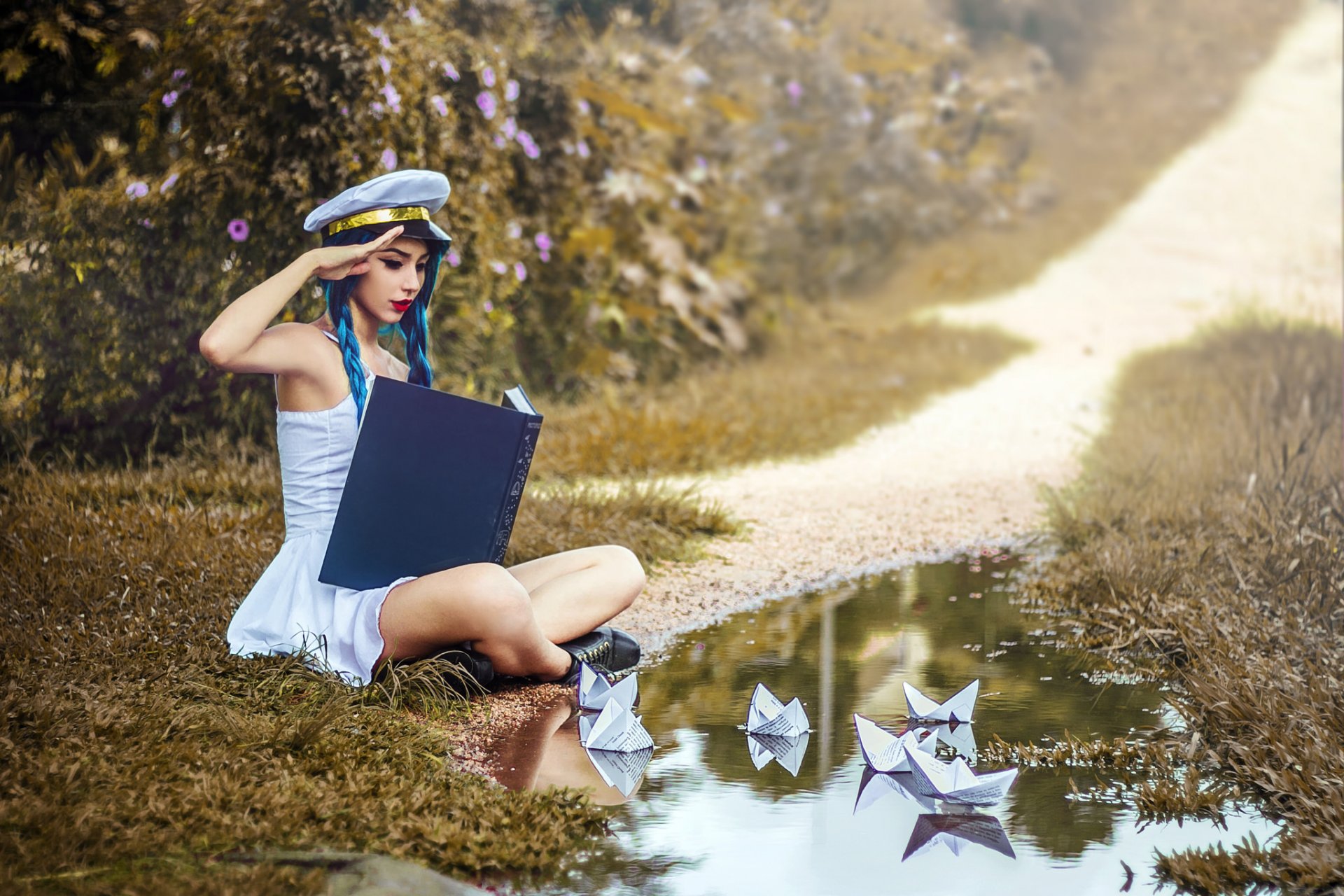 A girl is playing, in a puddle of paper boat, a girl in a captain's cap