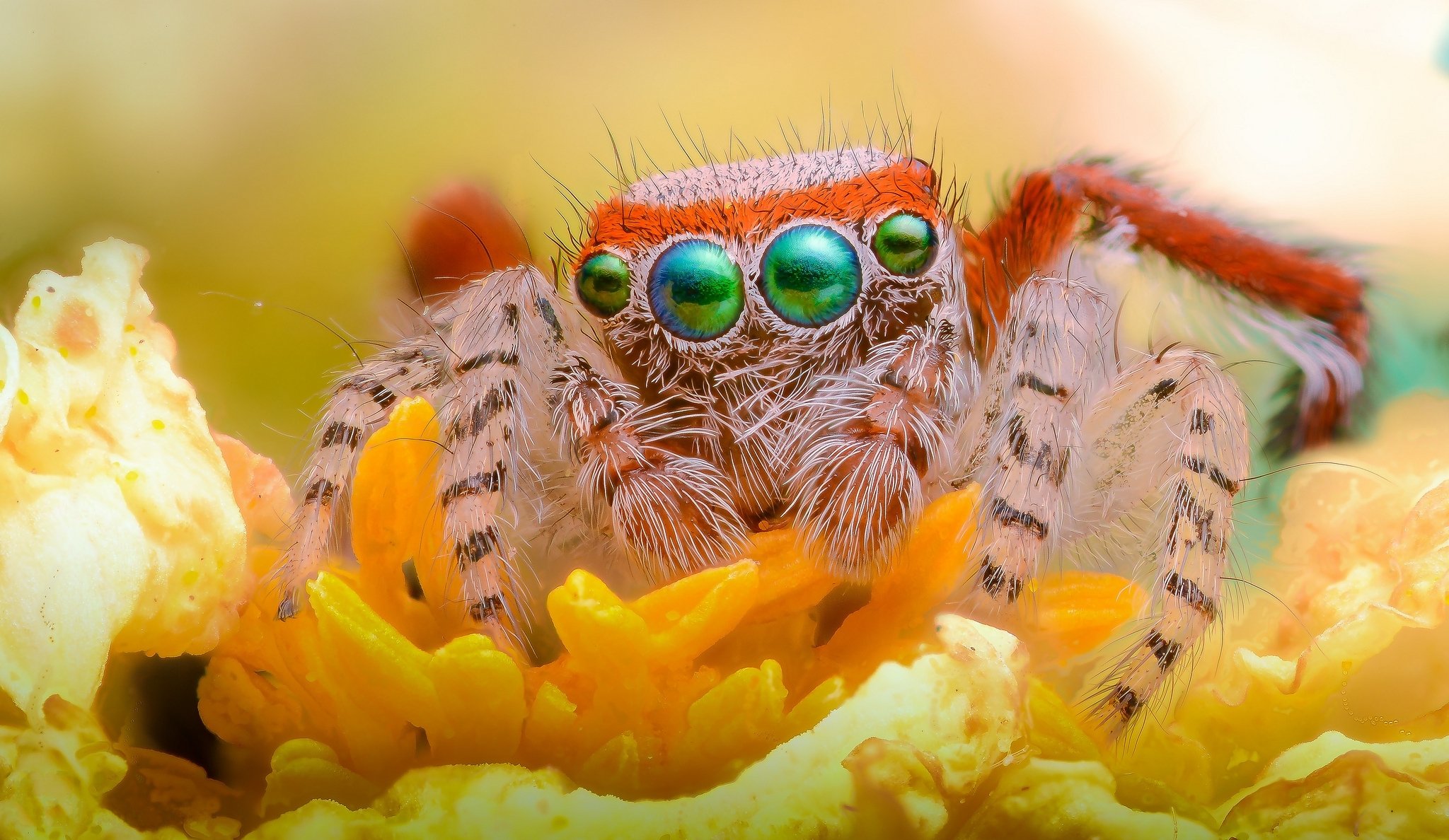 A girl's eye against a background of green skin with cobwebs and spiders on it