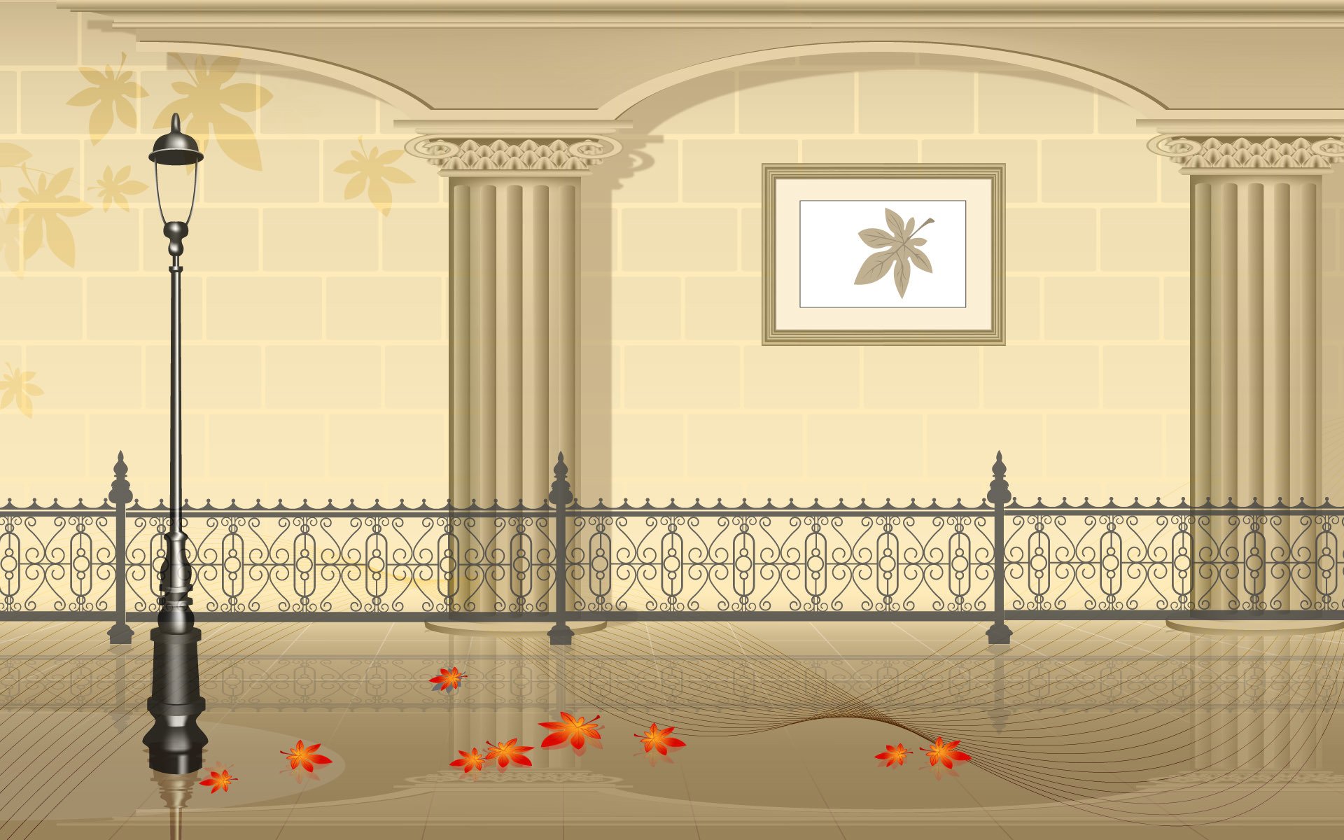 Autumn leaves next to a metal fence near the wall