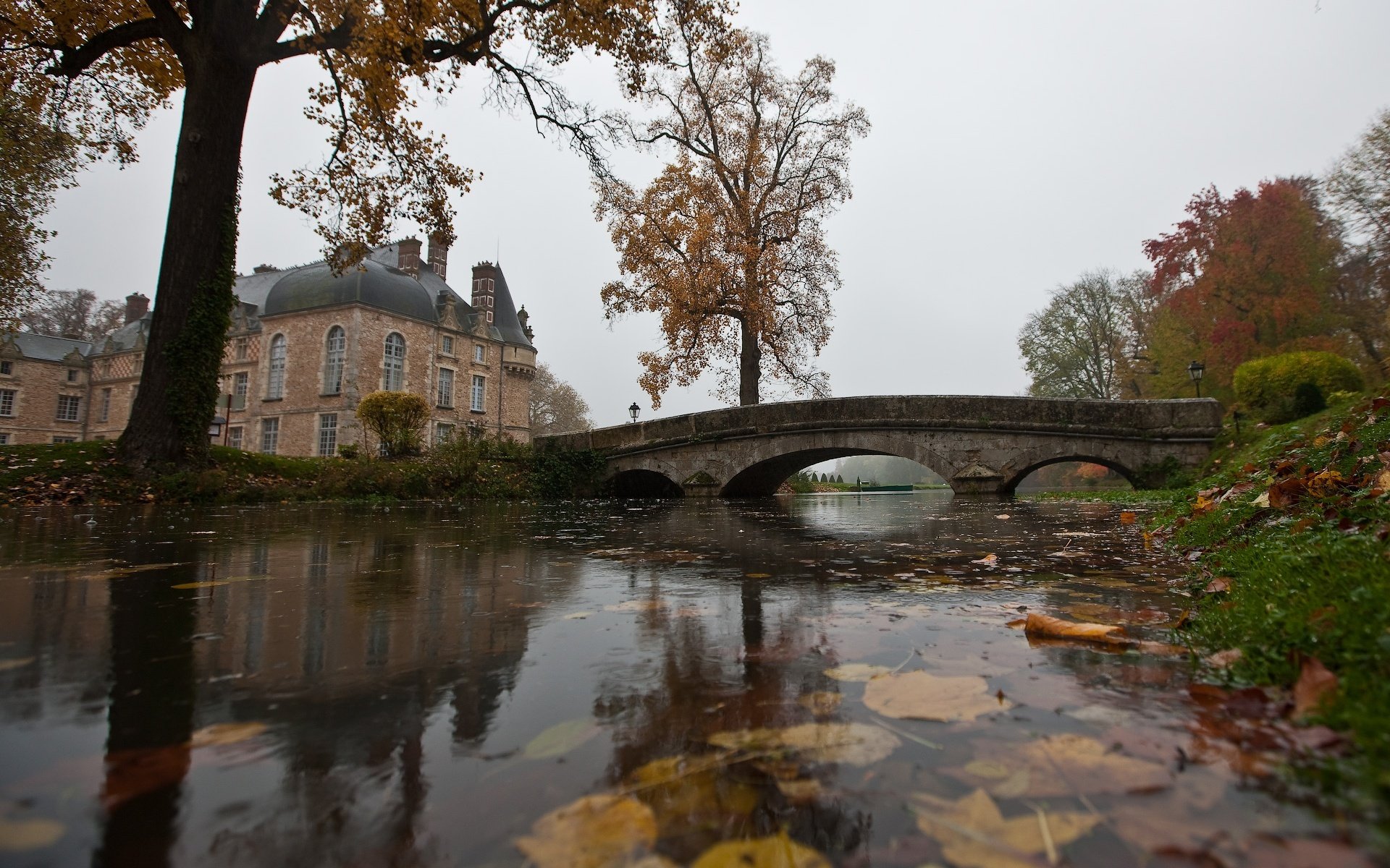 A large pond in the forest on the shore of which there are many trees with colorful foliage
