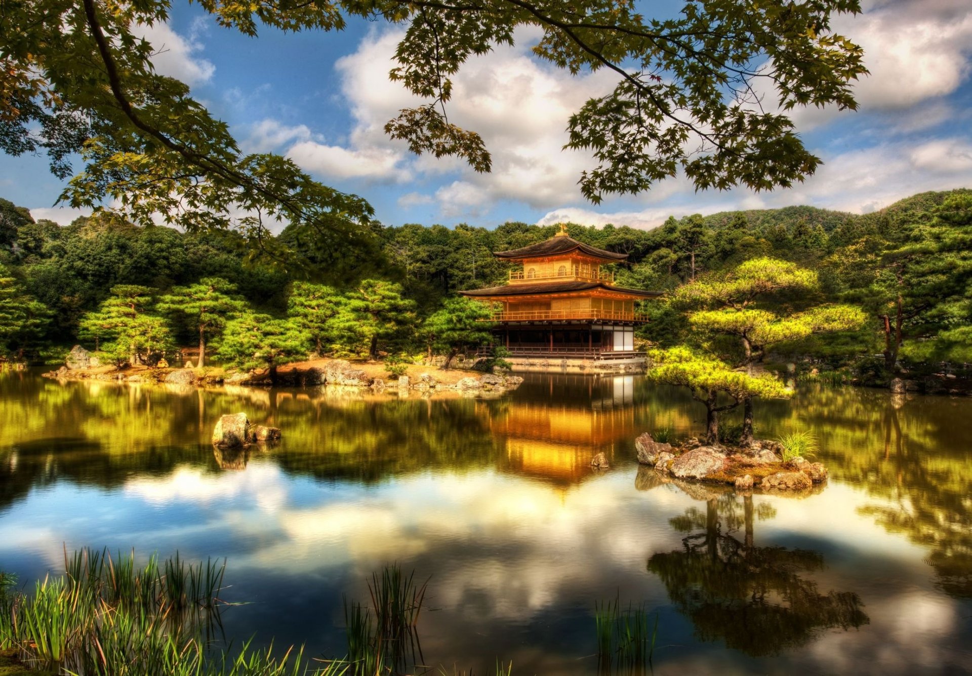 The gold of the Japanese temple pagodas is reflected in the waters and clouds
