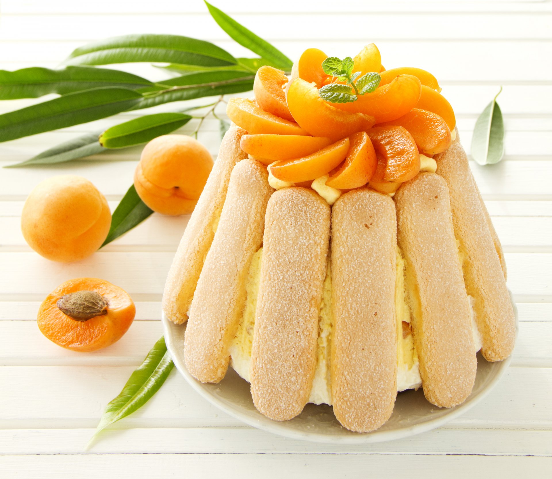 Cottage cheese cake decorated with apricots and mint