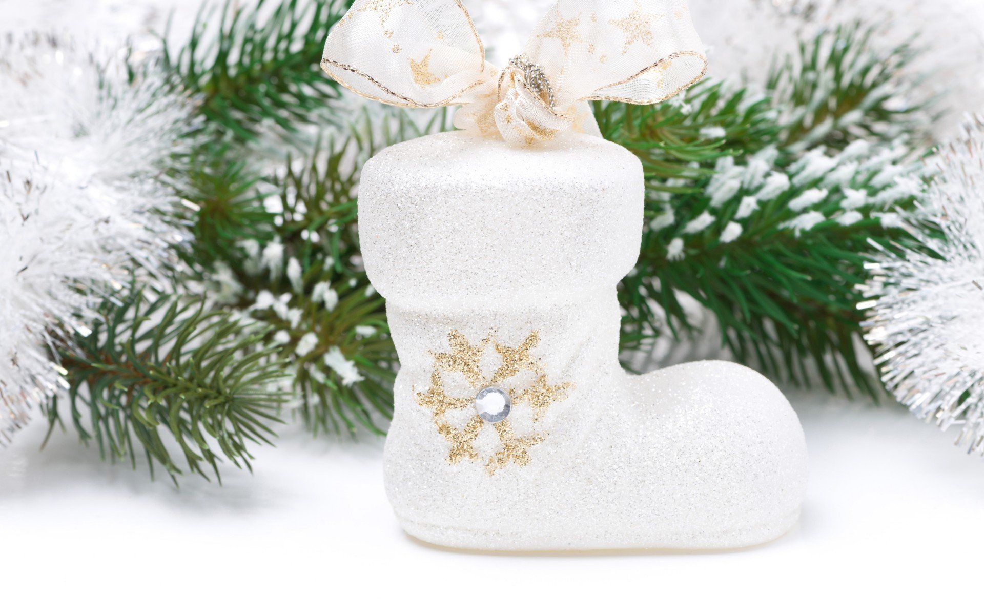 Red and white boots for Christmas, decorated with berries, a twig and a ball