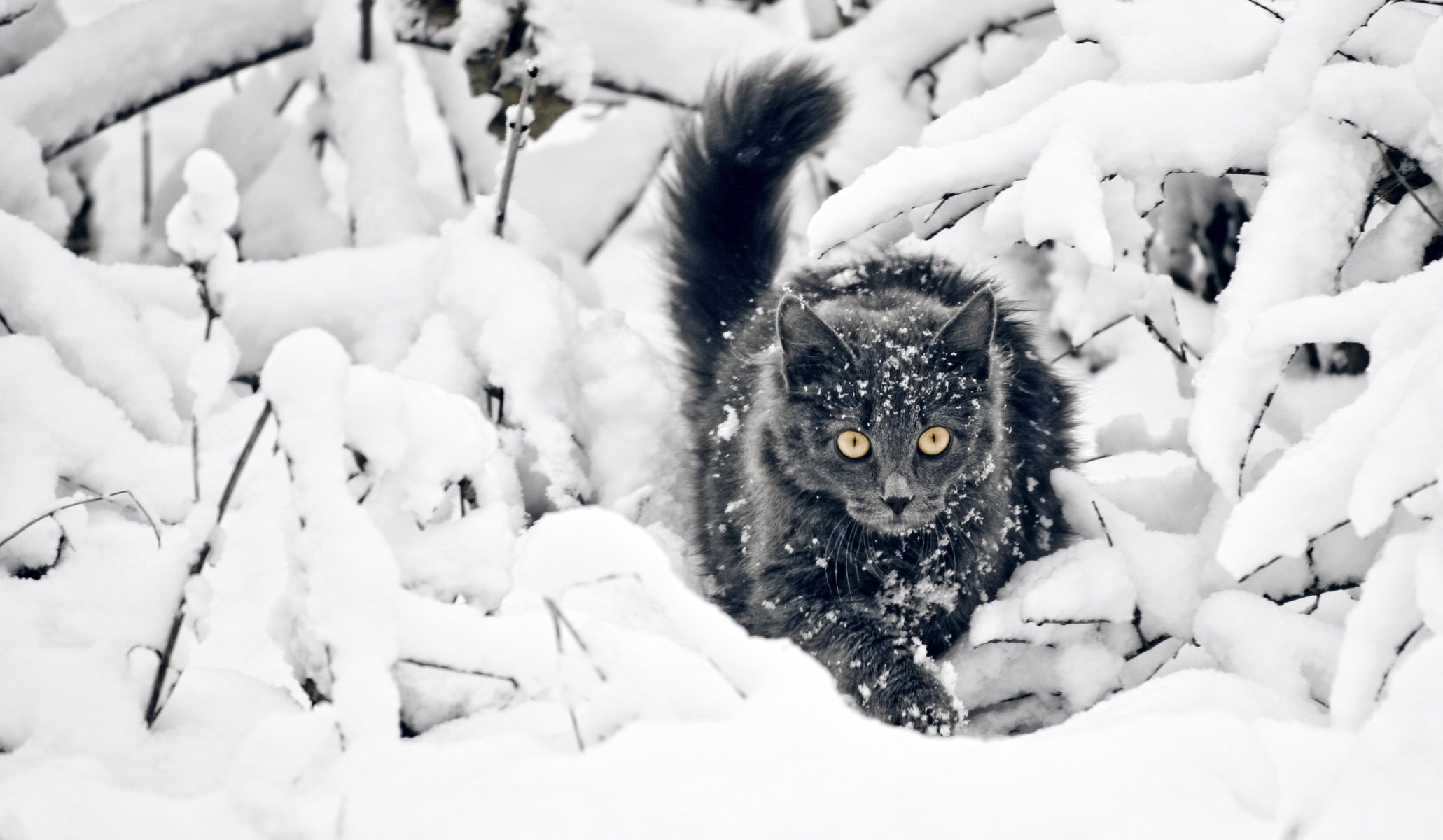 A snow-covered cat crawls through snowdrifts