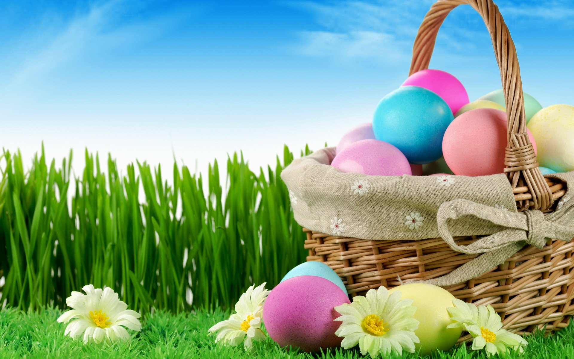 An Easter egg in a basket. Beautiful flowers. Colorful eggs on the table