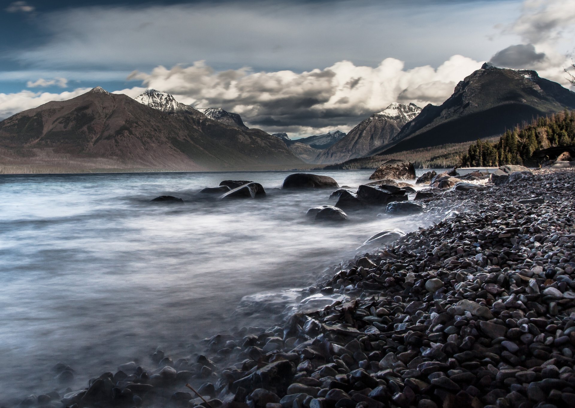Mountain lake with black stones on the shore