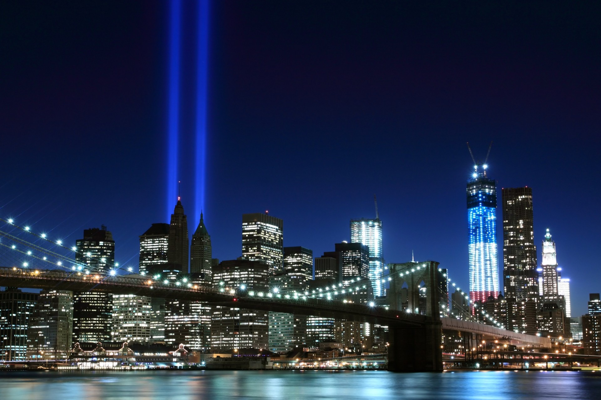 The night lights of New York. View of the Brooklyn Bridge and illuminated skyscrapers. Big City Lights