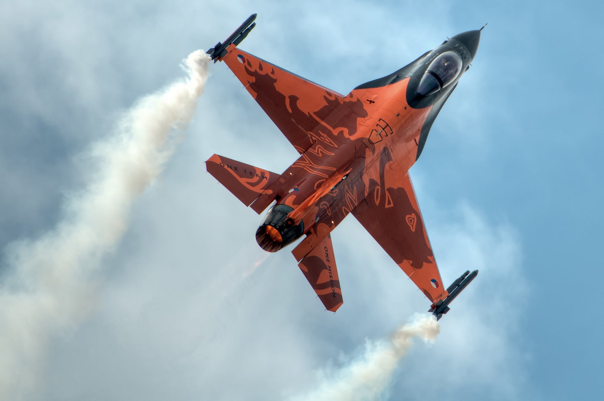 Multi-purpose fighter F-16 "Fighting Falcon" in red coloring on a blue sky background.