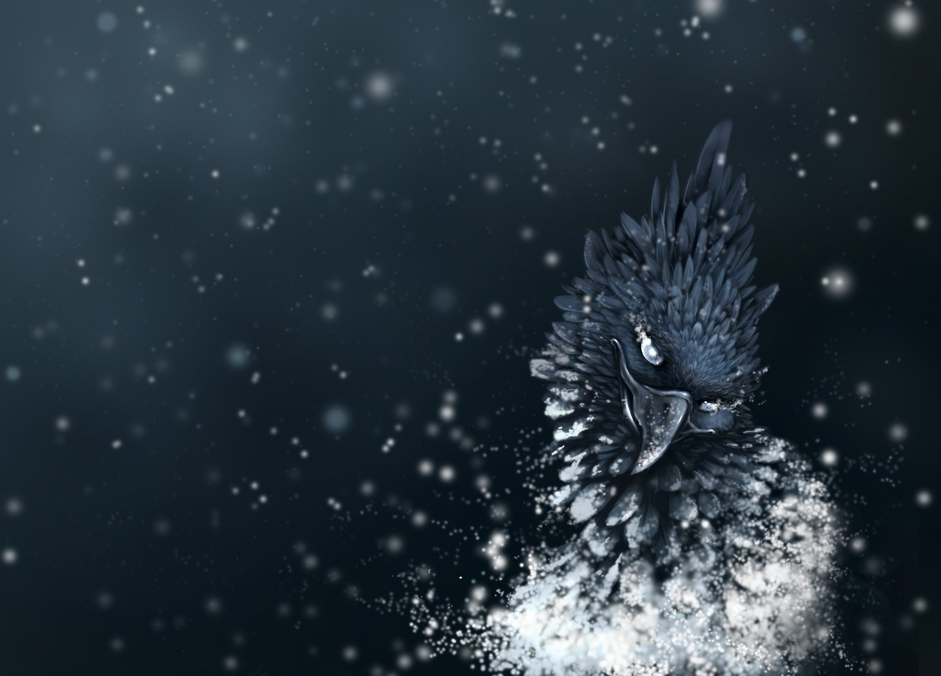 An owl is sitting on a bed in the bedroom, and feathers are around it
