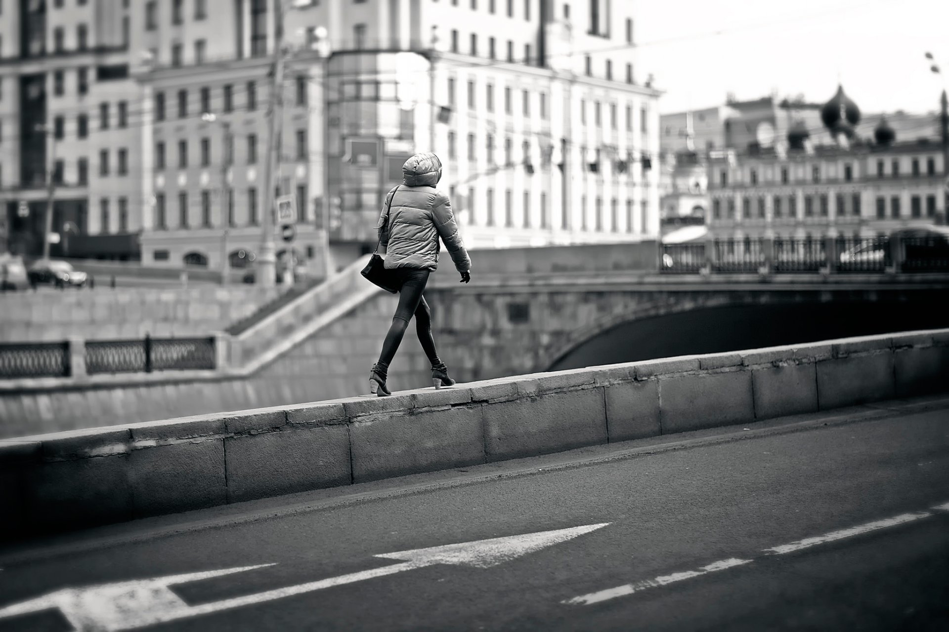 The girl walking on the edge of the bridge