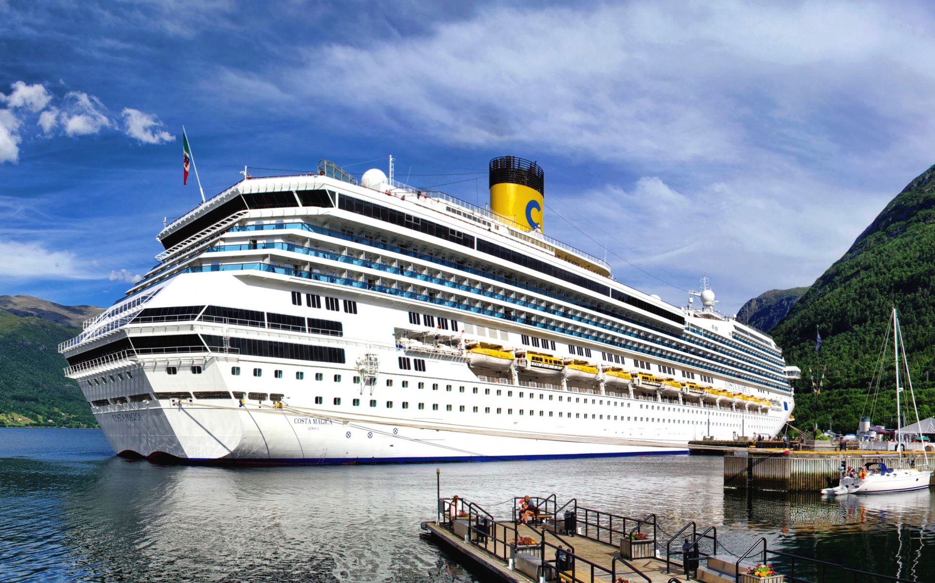 A huge passenger liner in a beautiful bay