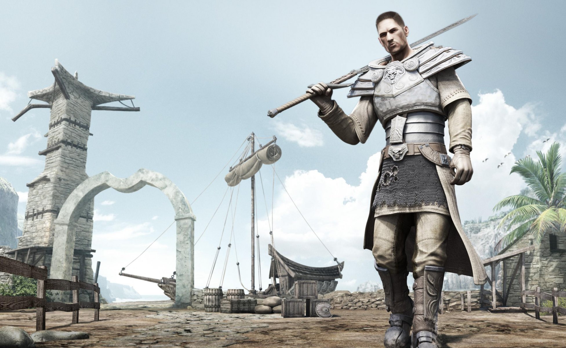 A warrior in armor with a sword walks through the village