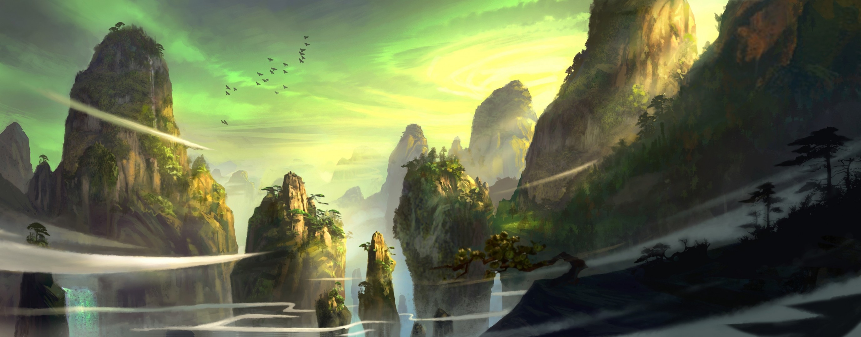 Abstract glowing purple infinity sign flying away from the wind on the background of a snow-covered valley with rocks