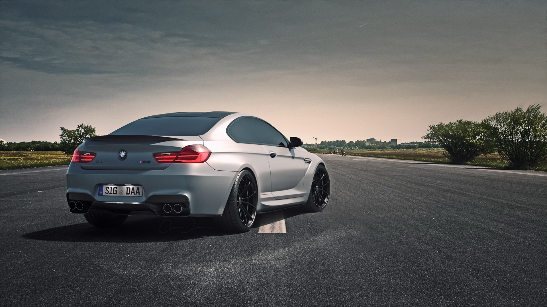A grey bmw on a road stretching into the distance