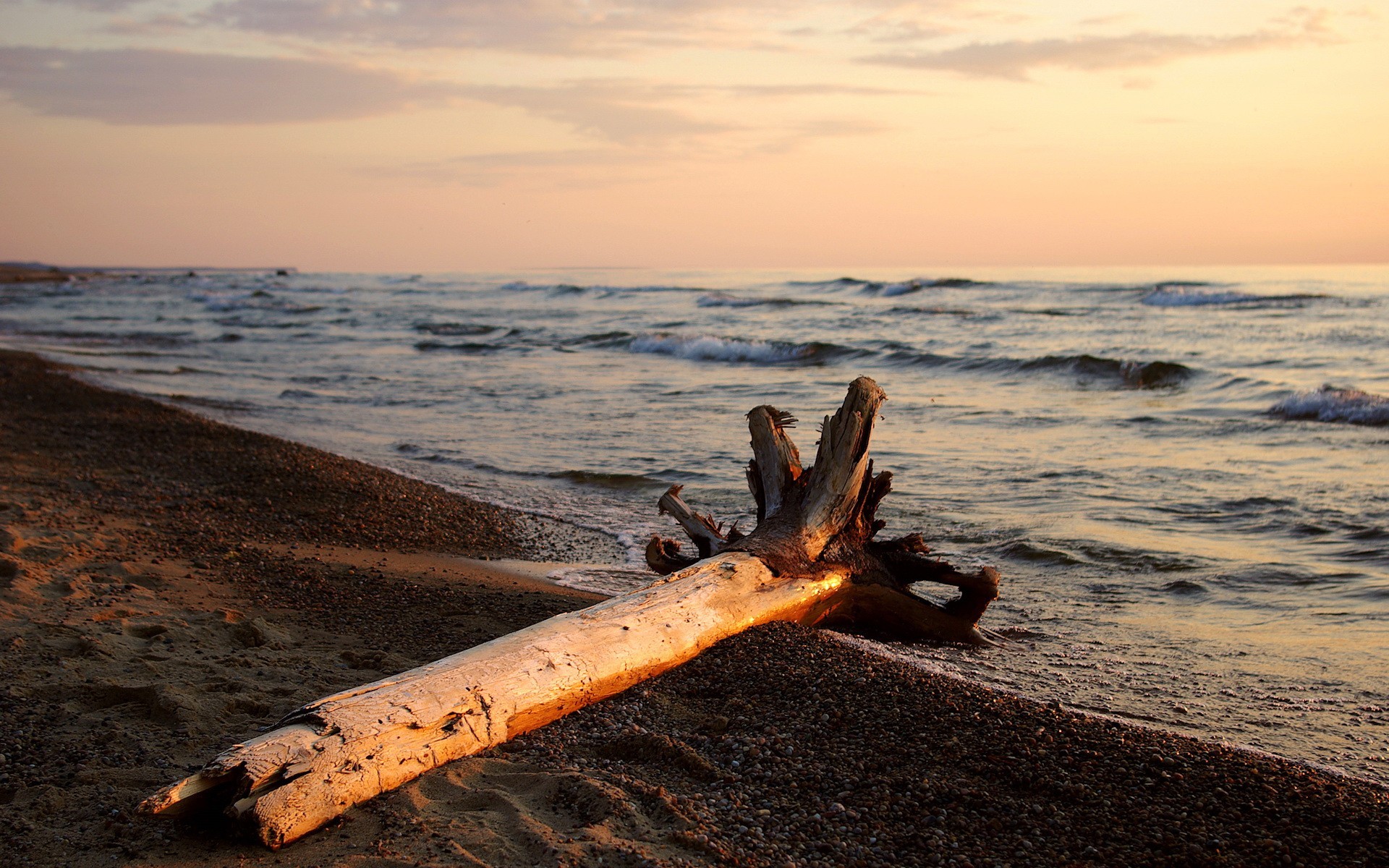 A snag on the bank of the sunset sky river