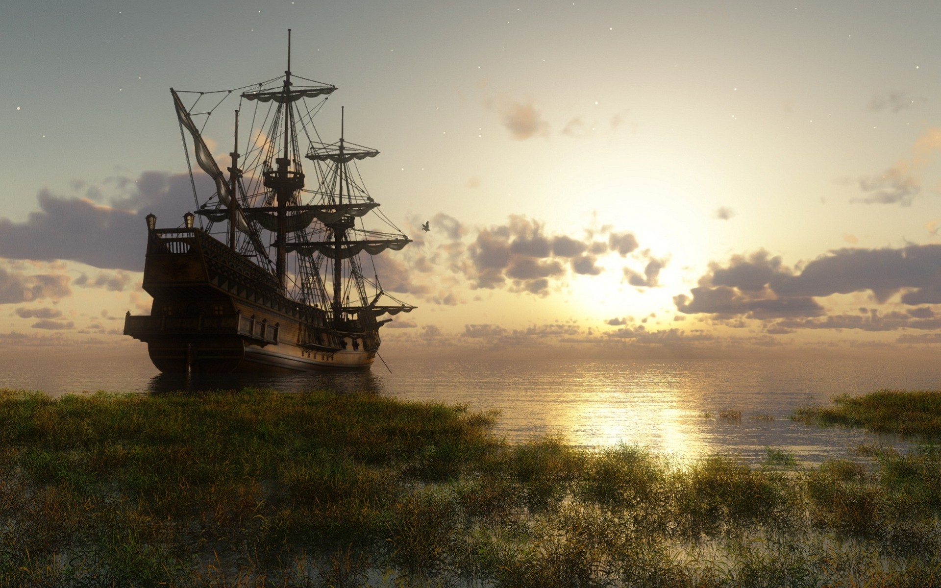 A ship in the bay at sunset