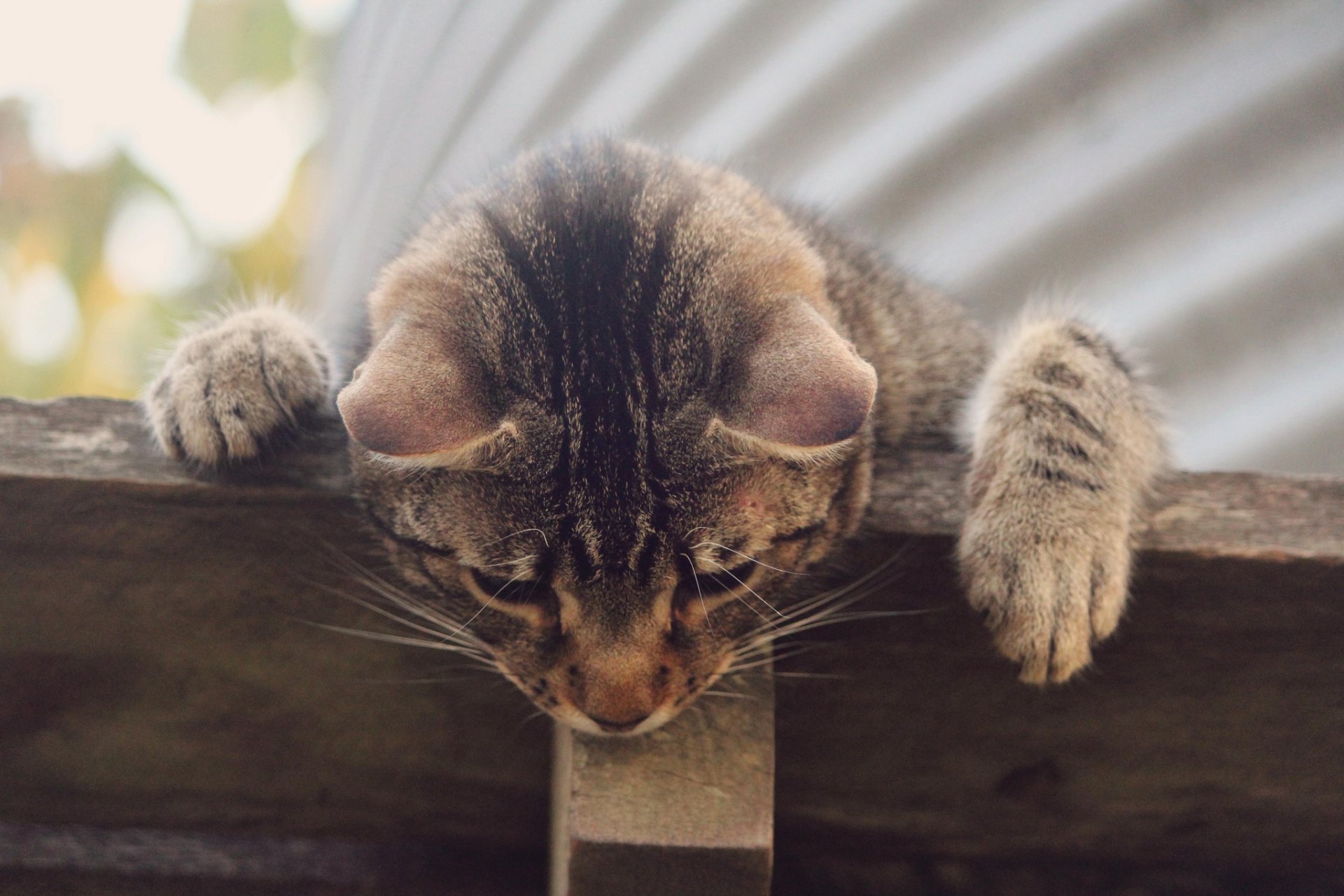 Striped cat sleeps with his paws spread out