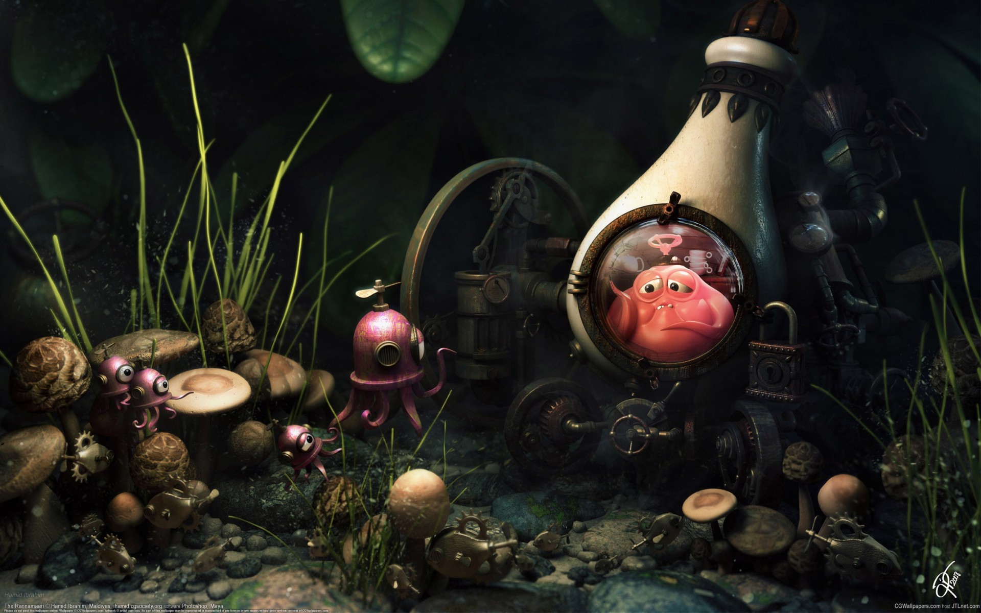 Mushrooms on long thin legs grow in a sunny green forest clearing