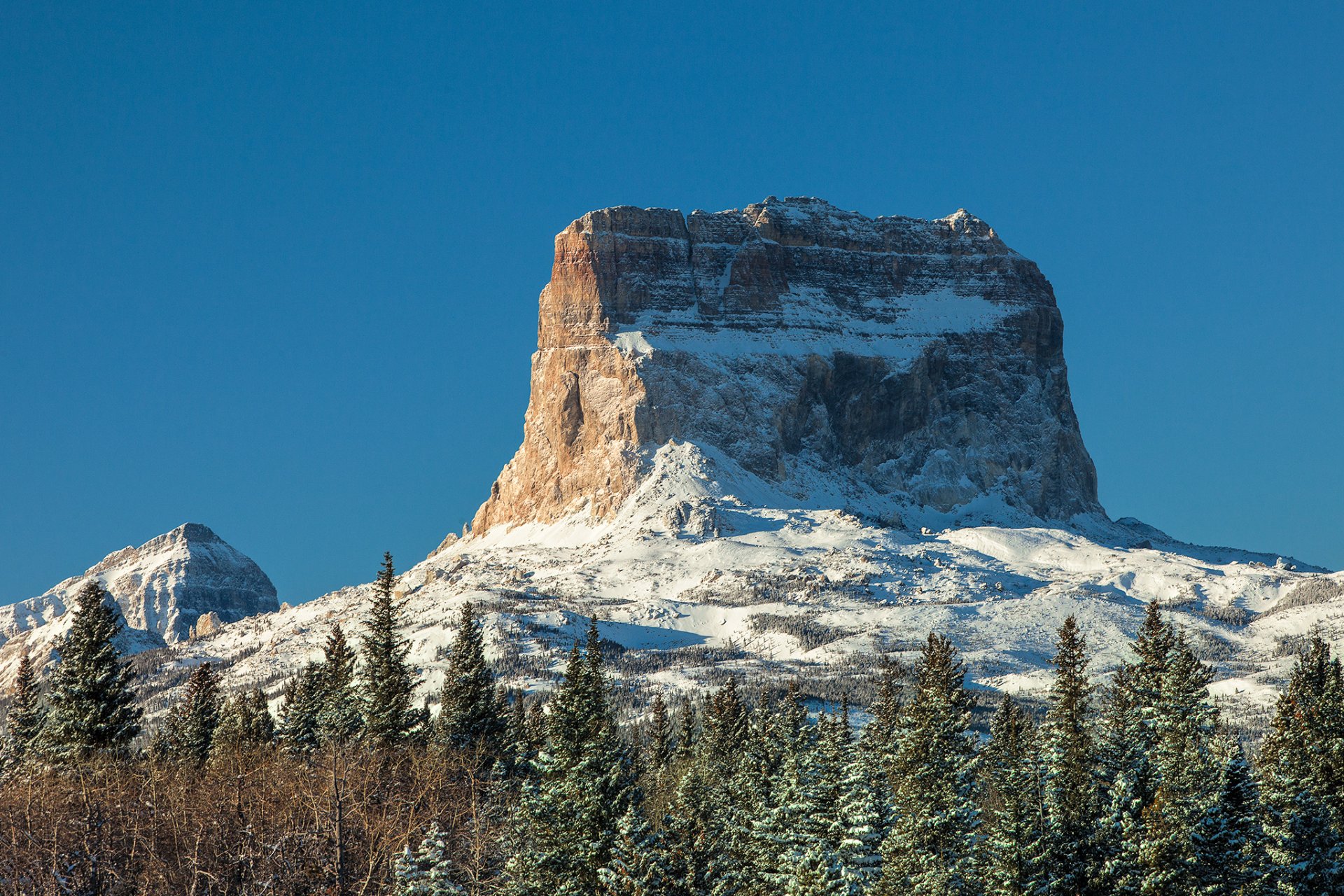 The rock of unusual shape is covered with snow
